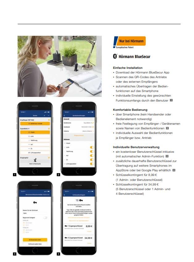Über den serienmäßigen Bluetooth-Empfänger bedienen Sie den Antrieb mit der Hörmann BlueSecur App auf Ihrem Smartphone. - Einfache Abfrage der Torposition