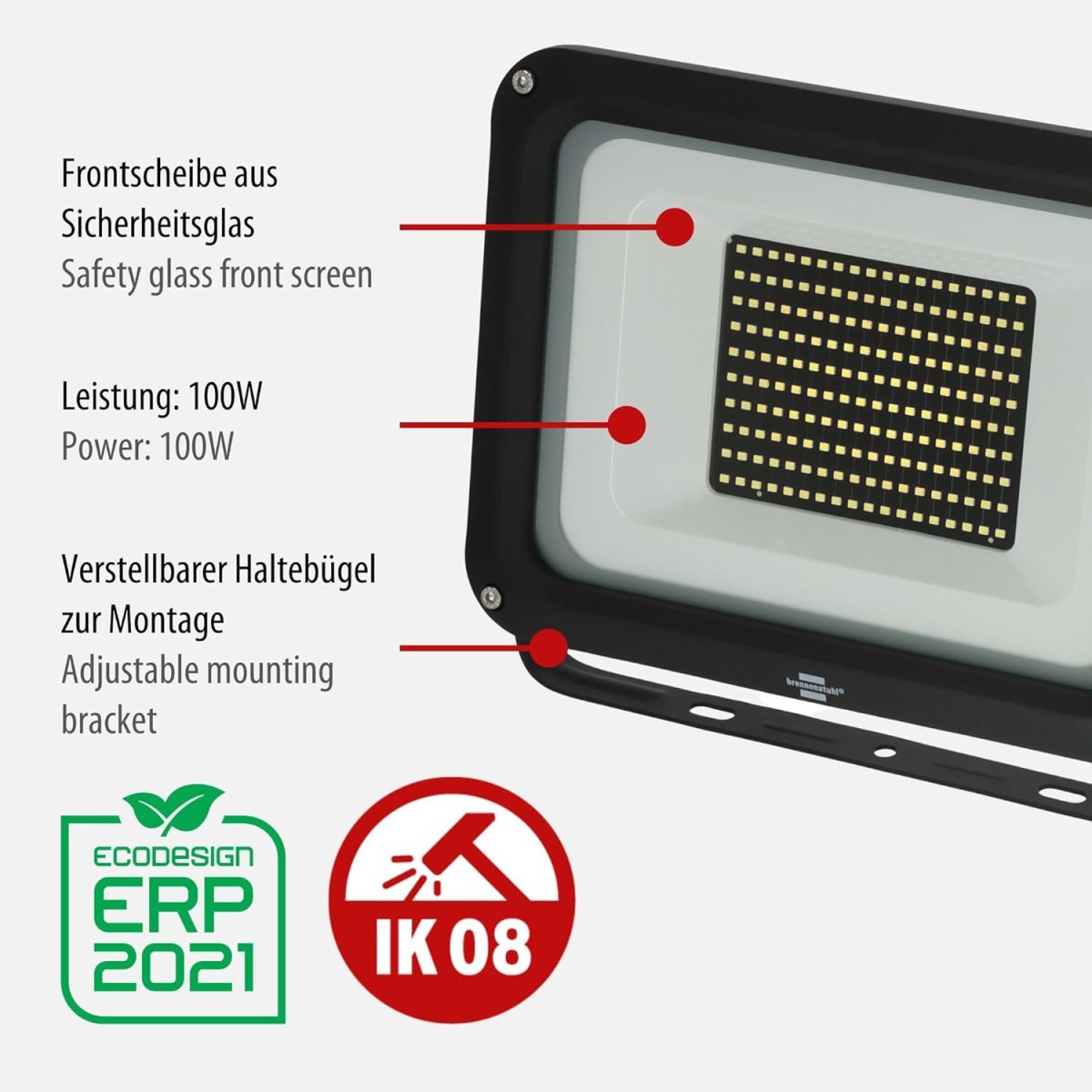 - LED-Außenstrahler 100W mit verstellbarem Haltebügel zur Montage und einer tageslichtweißen Lichtfarbe (6500K)