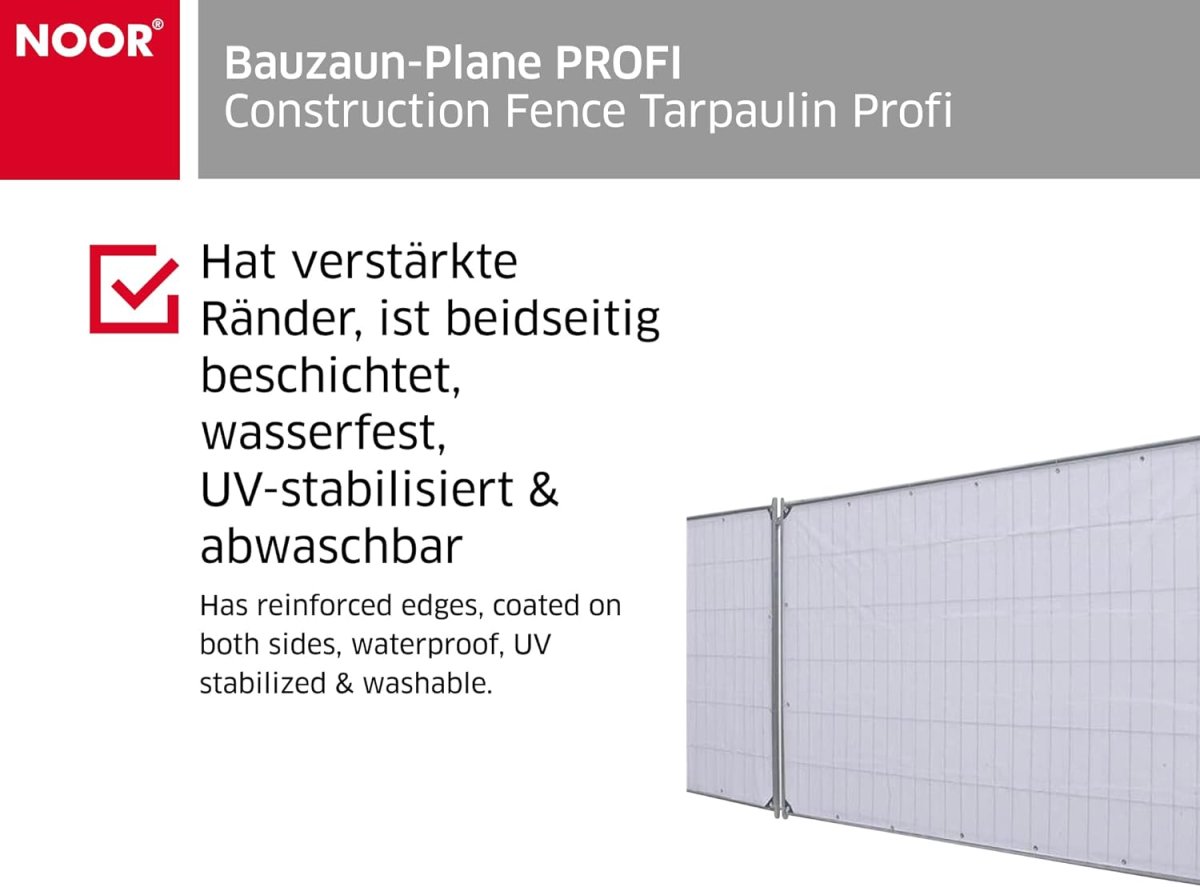 Unsere Bauzaunplane Profi in weiß passt auf die meisten handelsüblichen Bauzäune mit der Abmessung von etwa 1,76 x 3,41 m (die Abmessungen sind ca.-Maße +/-5%). Das Material ist aus belastungsstarkem PP/PE-Gewebe, was zu einem allgemeinen starken Endergebnis beiträgt. Das PP/PE-Gewebe ist von Grund auf bereits sehr strapazierfähig und noch mit einigen sehr nützlichen Eigenschaften ausgestattet, damit Sie unter allen denkbaren Bedingungen damit arbeiten können.