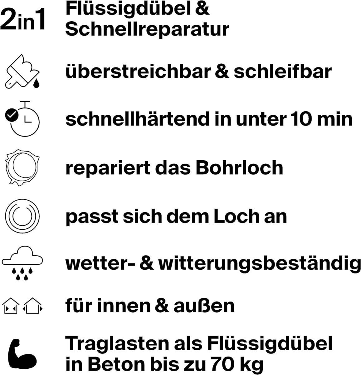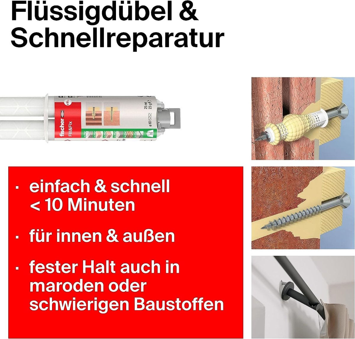 Flüssigdübel und Reparaturmasse mit optimaler Eignung für die Reparatur/Ertüchtigung ausgerissener Bohrlöcher oder für die Befestigung leichter Gegenstände in schwierigen oder maroden Baustoffen wie sie z.B. in Altbauten vorkommen können.