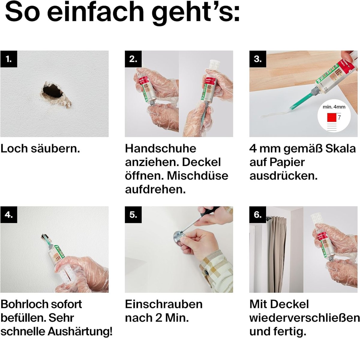 - Inhalt: 1 Kartusche 25 ml, 2x Statikmischer, 4x Siebhülsen, 2x Verlängerungsschläuche
