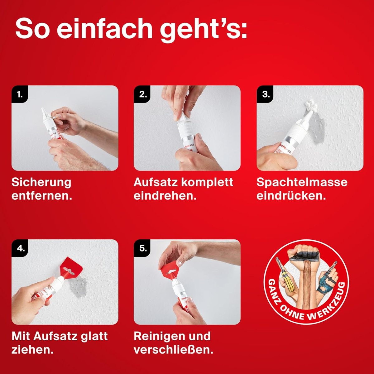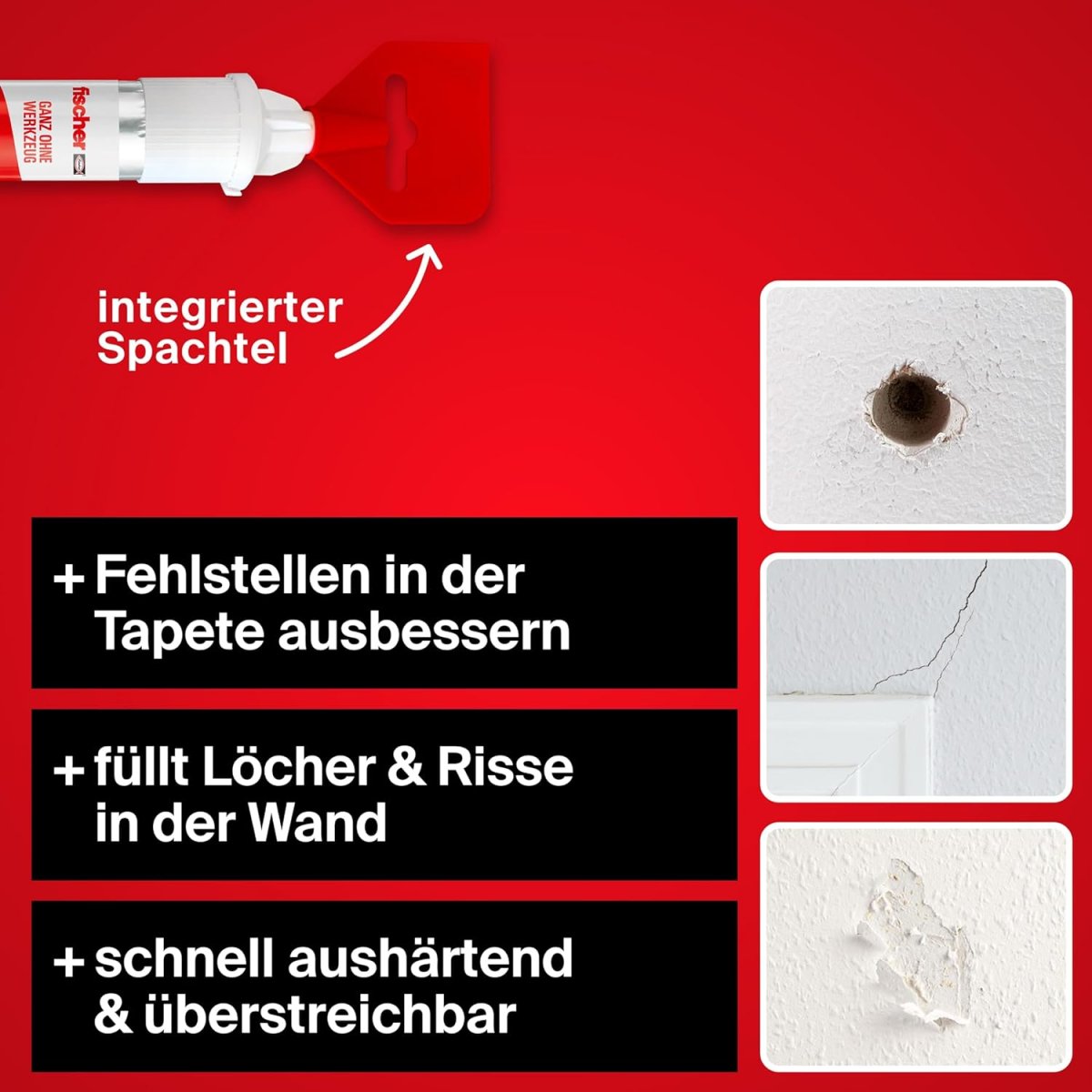 - Schnellaushärtend und dank integriertem Spachtel ist die Reparatur mit einem Handgriff abgeschlossen.