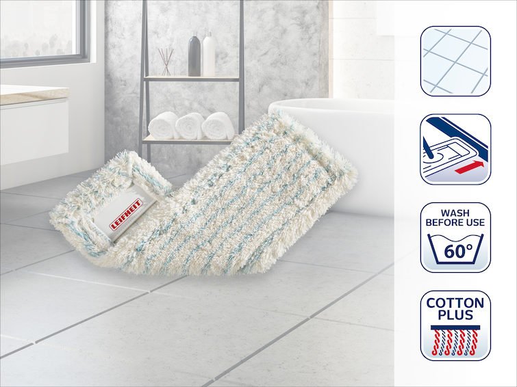Porentiefe Reinigung von Steinböden und Fliesen: Der Leifheit Wischbezug Profi XL cotton plus. Der Wischüberzug besteht aus einer Mischung von Suprafasern, die den Schmutz aus Unebenheiten und Fugen lösen, und Baumwollfasern die den gelösten Schmutz aufnehmen und das Wasser speichern. Er lässt sich bis zu 400x bei 60°C in der Maschine waschen, ohne seine Reinigungsleistung zu verlieren.