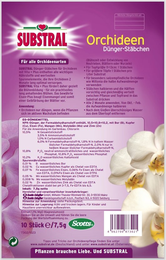 SUBSTRAL® Orchideen Dünger-Stäbchen mit Vita + Plus enthalten alle wichtigen Nährstoffe und wertvollen Spurenelemente, die Ihre Orchideen zwei Monate lang optimal versorgen.
