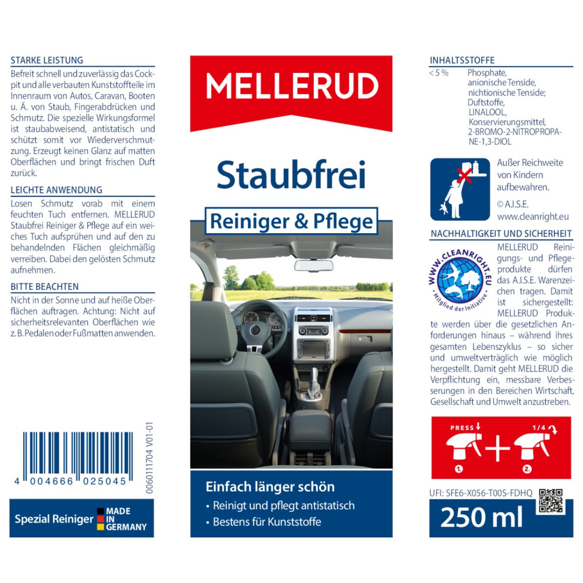 Mit dem MELLERUD Staubfrei Reiniger & Pflege erhalten Sie einen treuen Begleiter für die schnelle Reinigung unterwegs.