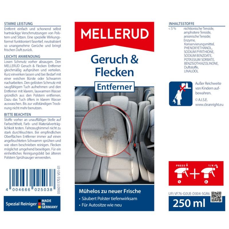 Die hochspezialisierte Rezeptur sorgt für neue angenehme Frische, indem sie Gerüche nachhaltig entfernt und die Geruchsquellen effektiv zersetzt. So erhalten Sie eine nachhaltige Lösung, statt nur die Gerüche zu überdecken. Gleichzeitig hilft Ihnen der Reiniger auch visuell. Das Mittel entfernt sämtliche Arten von Flecken aus Polstern und Textilien. Hartnäckige Verschmutzungen sind mit dem MELLERUD Geruch & Flecken Entferner im Handumdrehen beseitigt und die Polster erscheinen wieder wie neu.