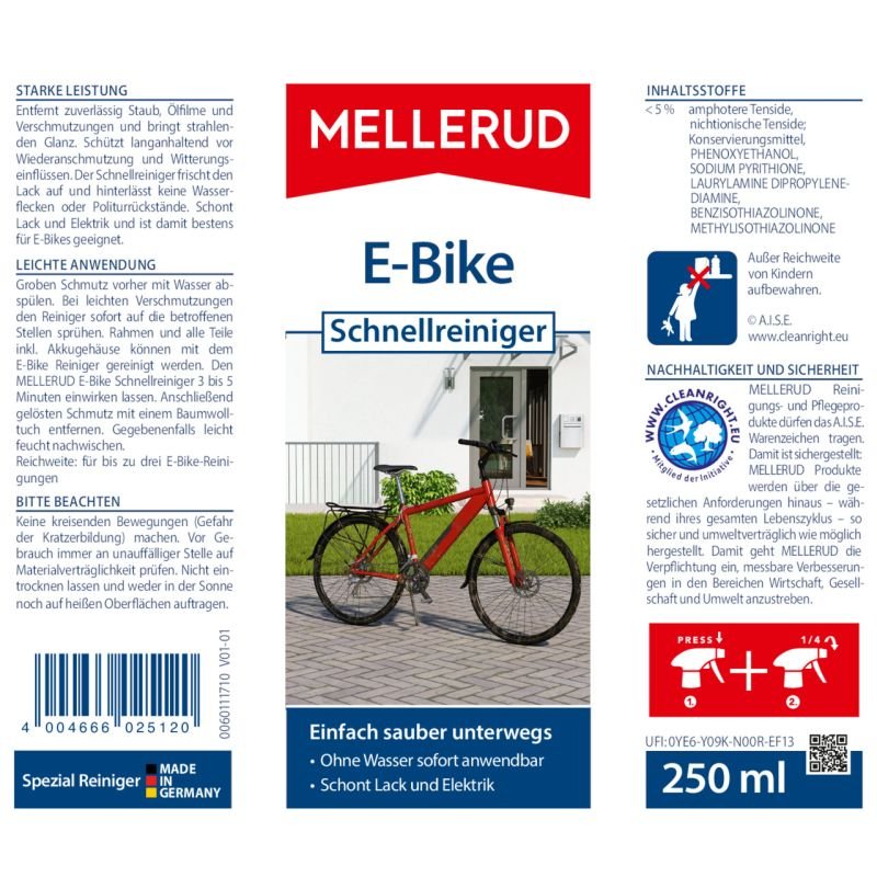 Der MELLERUD E-Bike Schnellreiniger beseitigt dabei tiefenwirksam Ölfilme, Schmutzanhaftungen und Dreck. Er verleiht Ihrem Rad den gebührenden Glanz und hinterlässt eine farbauffrischende Schutzschicht, die vor Wiederanschmutzung und Witterungseinflüssen schützt. Gleichzeitig ist die Rezeptur auf die Reinigung Ihres Elektro-Bikes zugeschnitten - Lack, Elektrik und Kontaktstellen werden geschont, was der Lebensdauer zugute kommt.