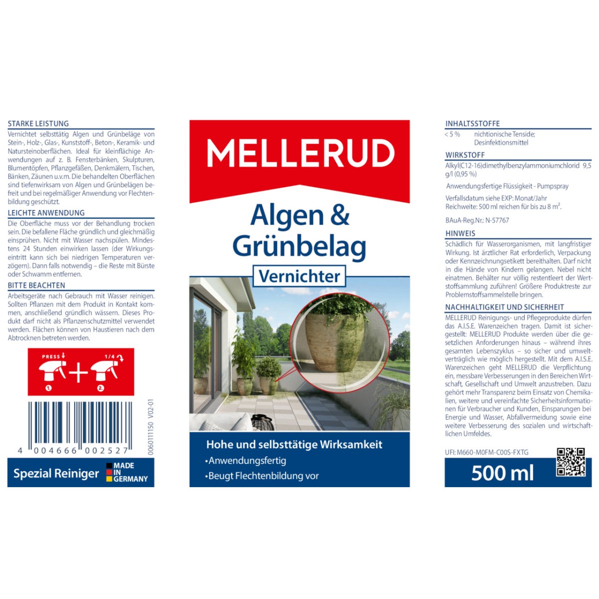 Der MELLERUD Algen & Grünbelag Vernichter beseitigt selbsttätig und tiefenwirksam Algen und Grünbeläge von Stein-, Holz-, Glas-, Kunststoff-, Beton- und Keramikoberflächen.