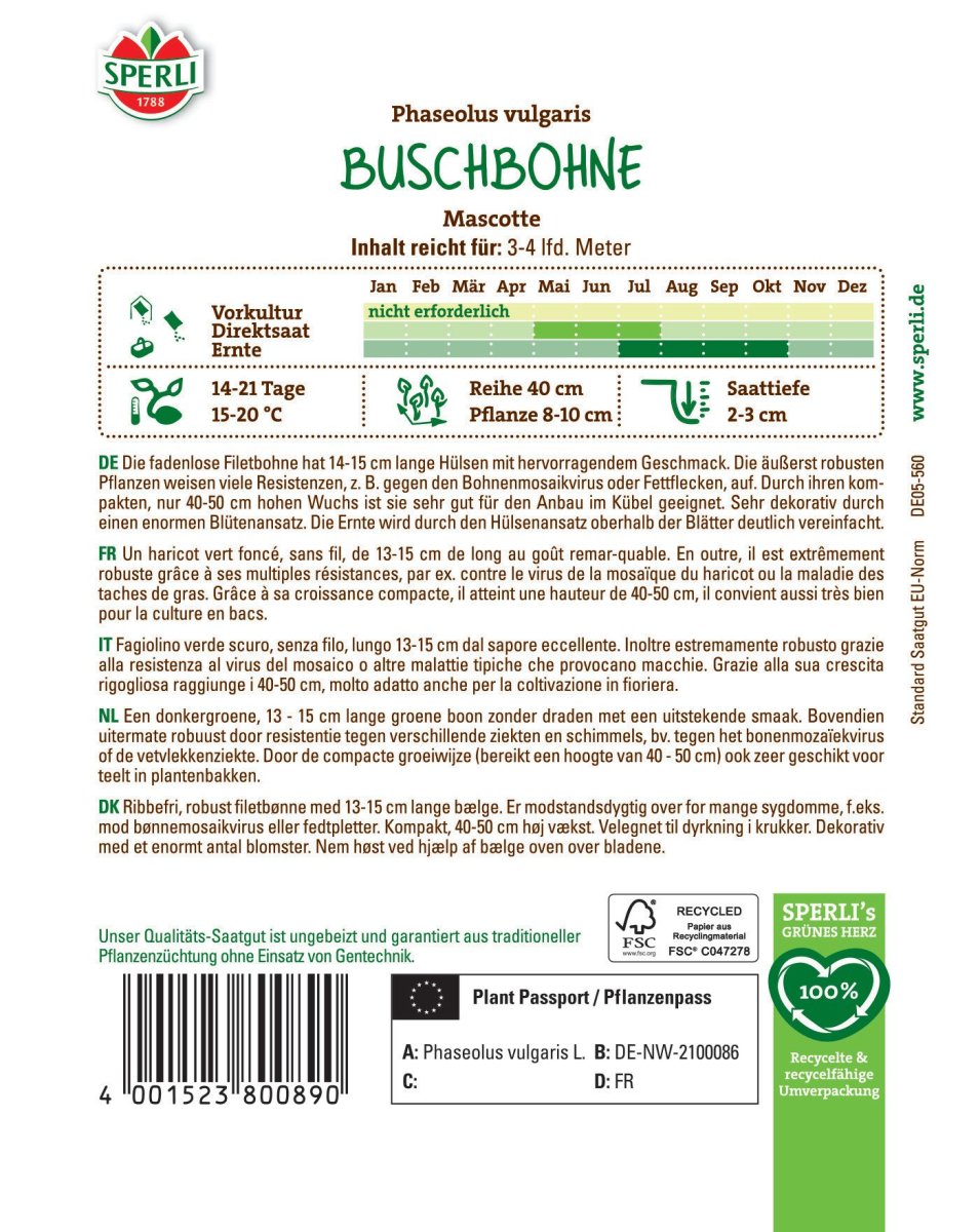 Gemüsesamen - Fadenlose Filetbohne, kompakt und robust - Art.Nr.: 80089 Artikel-Nr.: 86000986 Hersteller: SPERLI GmbH