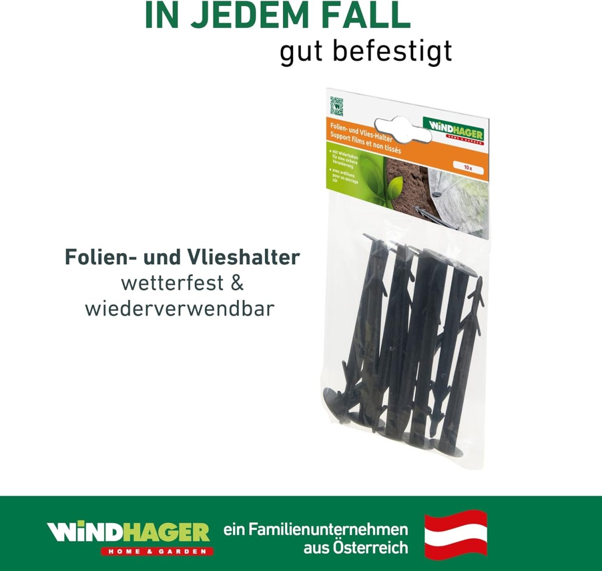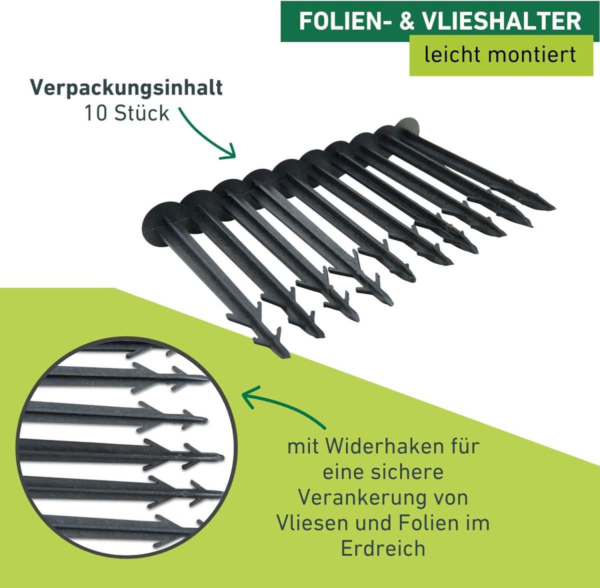 Aus stabilem Kunststoff, mit Widerhaken für eine sichere Verankerung von Vliesen und Folien im Erdreich.