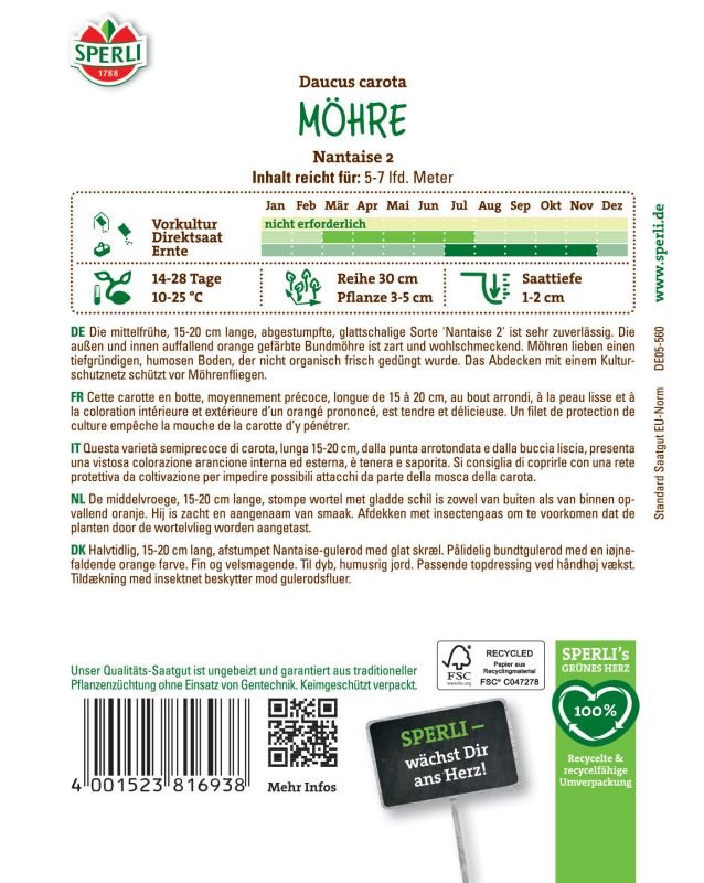 Die Möhre 'Nantaise 2' ist eine mittelfrühe, halblange Bund- und Waschmöhre. Sie färbt sich sehr frühzeitig orange durch und ist zudem gut abgestumpft und glattschalig. Diese schmackhaften Möhren sind vielseitig zu verwenden als Rohkost, als gekochtes oder geschmortes Gemüse, zu Eintöpfen, Suppen oder als frisch gepresster Saft. Hinzu kommt, dass sie sich auch zum Tiefgefrieren eignen.