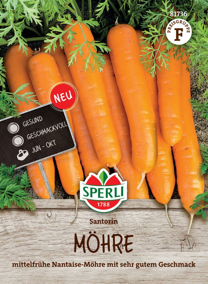 Die mittelfrühe Möhre 'Santorin' ist vom Nantaise-Typ und glänzt mit einem zuckersüßem Geschmack und zartem Fruchtfleisch. Die 18 bis 20 cm langen Möhren sind zylindrisch geformt und von appetitlich oranger Farbe. Schon im März kann die Aussaat erfolgen und ist ab da in Sätzen bis in den Juni hinein möglich. Die Pflanzen wachsen mit Vorliebe an sonnigen Standorten und auf tiefgründigen, lockeren Böden mit guter Nährstoffversorgung.