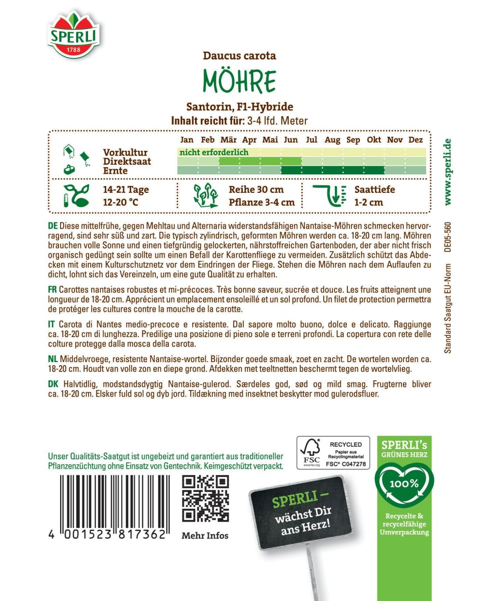 Gemüsesamen - Mittelfrühe Nantaise-Möhre mit sehr gutem Geschmack - Art.Nr.: 81736 Artikel-Nr.: 86001034 Hersteller: SPERLI GmbH