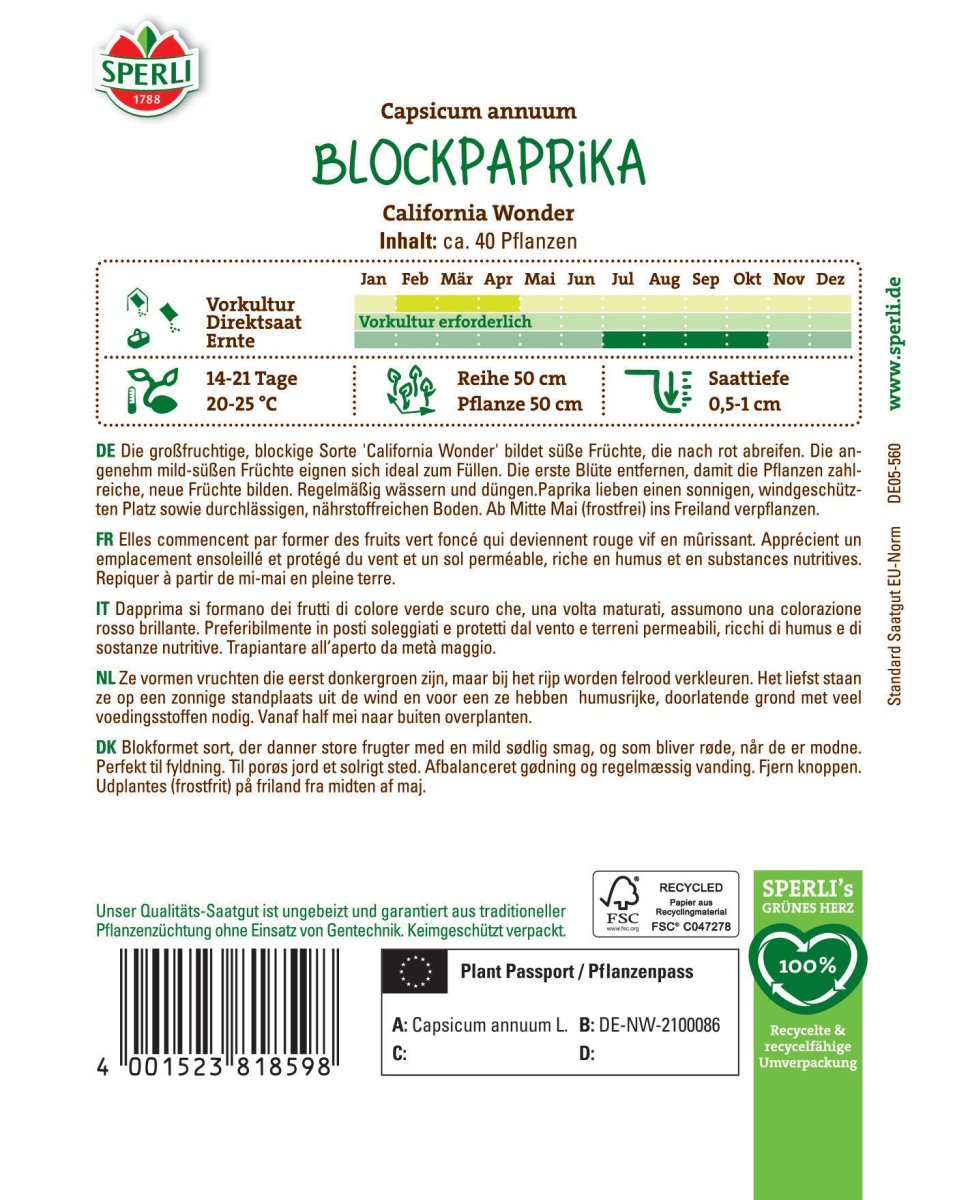 Mit der Paprika 'California Wonder' holst Du Dir eine mittelfrühe, starkwüchsige Sorte in Dein Gewächshaus, Frühbeet oder Gemüsebeet. Diese bewährte Blockpaprika bildet große, glockenförmige Früchte, die zunächst dunkelgrün sind, später aber leuchtend rot abreifen.Im Anschluss an die Vorkultur benötigen die Pflanzen einen sonnigen, windgeschützten Standort und einen humosen, durchlässigen und nährstoffreichen Boden. Von Juli bis Oktober erstreckt sich der Erntezeitraum.