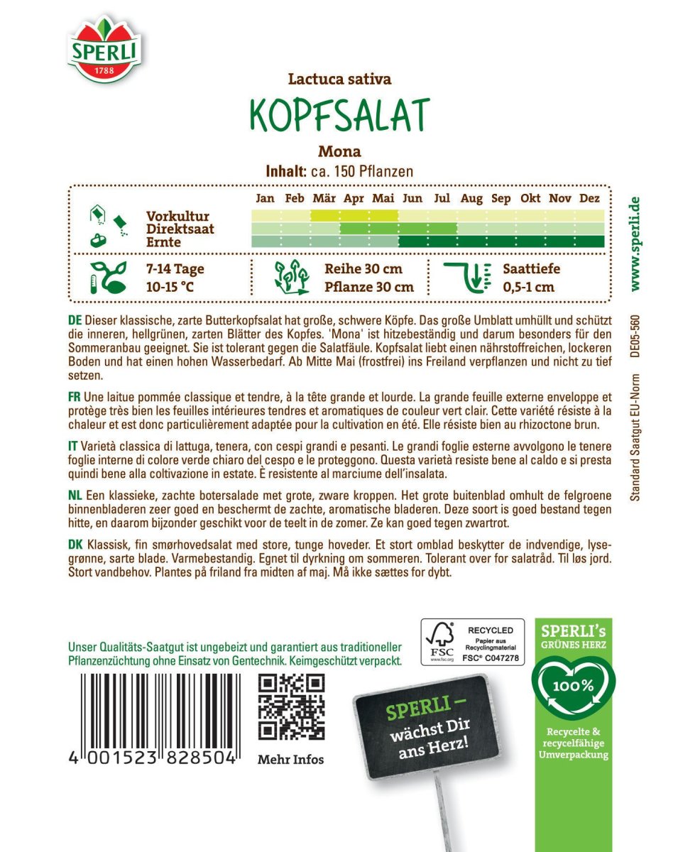Wenn Du auf der Suche nach einem Butterkopfsalat bist, der sich durch sehr zarte, aromatische Blätter auszeichnet, liegst Du mit dem Salat 'Mona' genau richtig. Die großen, schweren Köpfe bestehen aus hellgrünen Blättern, die von einem großen Umblatt umhüllt werden. Sie schmecken frisch und knackig und können auf vielfältige Art und Weise in der Küche verwendet werden.