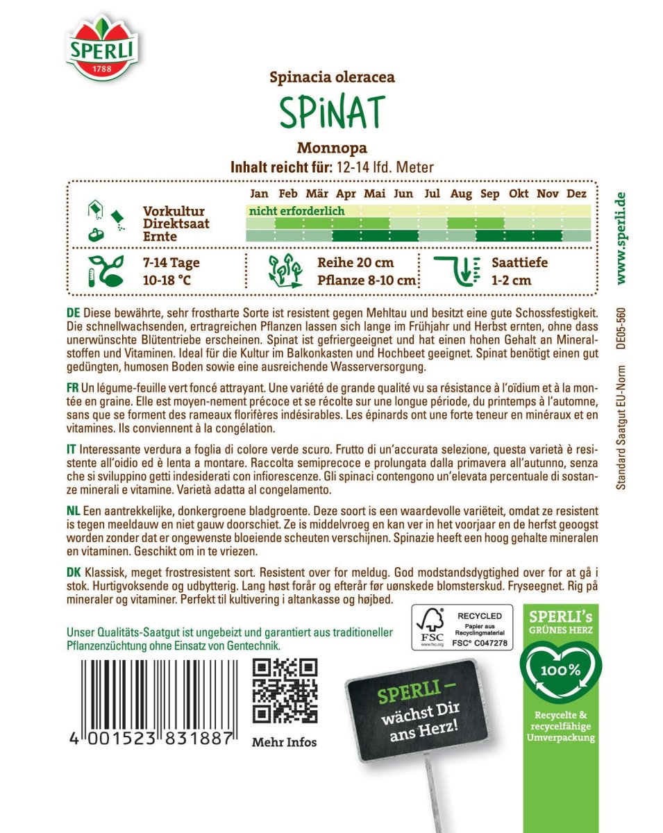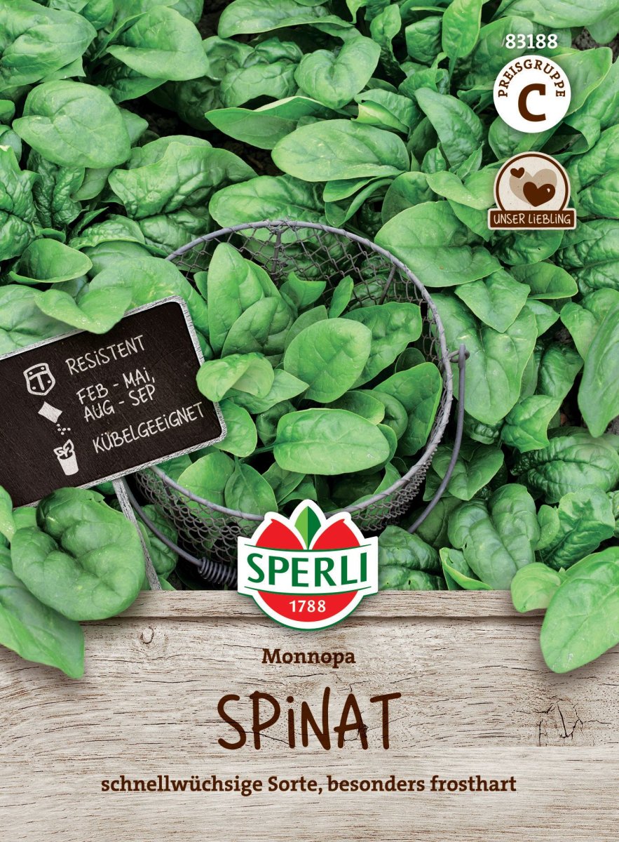 Spinat ist gedünstet, roh oder als Salat sehr beliebt. Der Spinat 'Monnopa' von SPERLI, der auch zum Tiefgefrieren geeignet ist, bildet diesbezüglich keine Ausnahme. Das attraktive dunkelgrüne Blattgemüse mit halb aufrecht stehendem Blatt kannst Du im Frühjahr, Herbst oder zur Überwinterung anbauen.