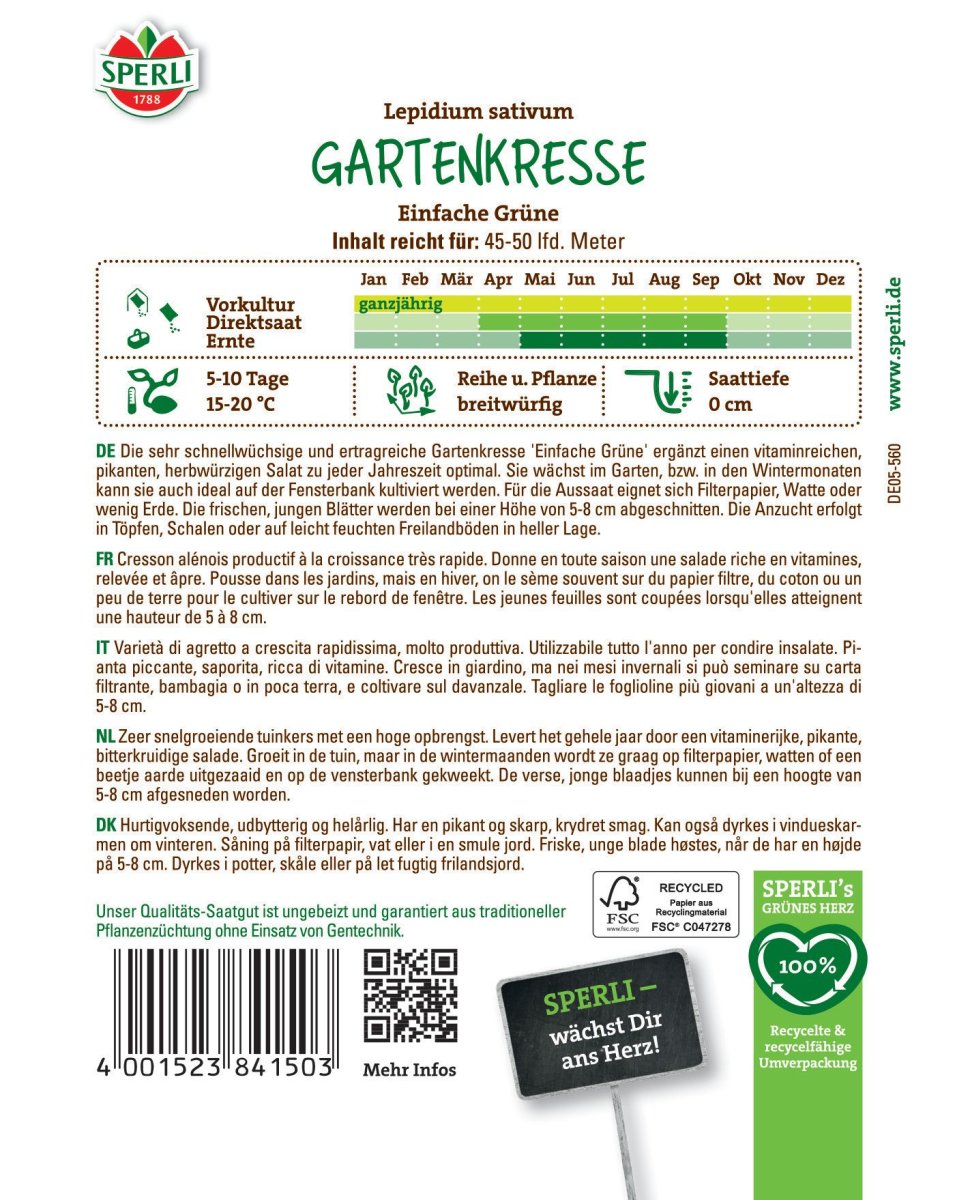 'Einfache Grüne' ist eine ertragreiche und vitaminreiche Züchtung. Ihre Blätter kannst Du ernten, sobald die Pflanzen etwa 5 bis 8 cm hoch sind. Ihr pikanter und herb-würziger Geschmack passt wunderbar zu Suppen und Soßen sowie zu Salaten.