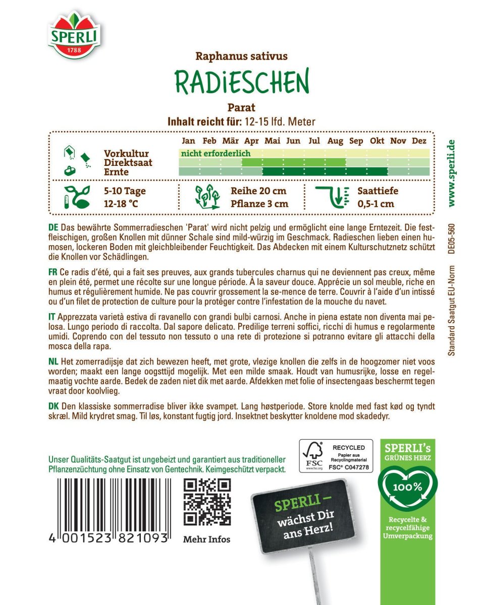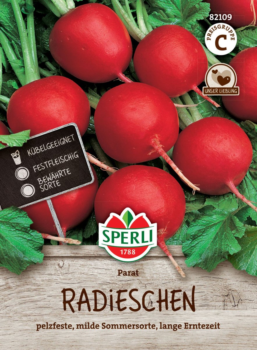 Wenn Du auf der Suche nach einer bewährten Sommersorte bist, ist das Radies 'Parat' von SPERLI die richtige Wahl! Diese Sorte kannst Du von April bis August und damit auch im Hochsommer aussäen. Ein sonniger bis halbschattiger Standort ist ideal, zudem sollte der Boden möglichst locker und humos, aber auch gleichmäßig durchfeuchtet sein.