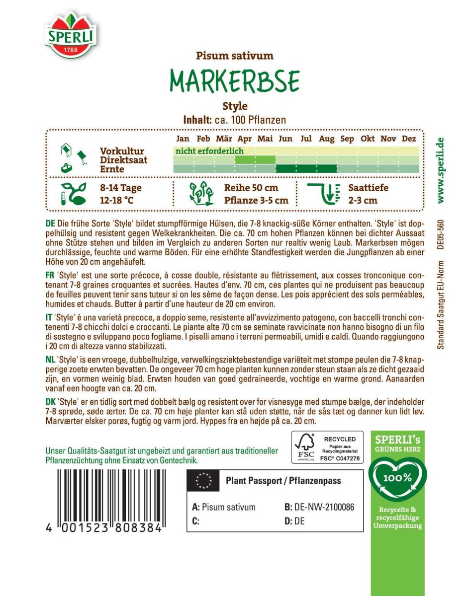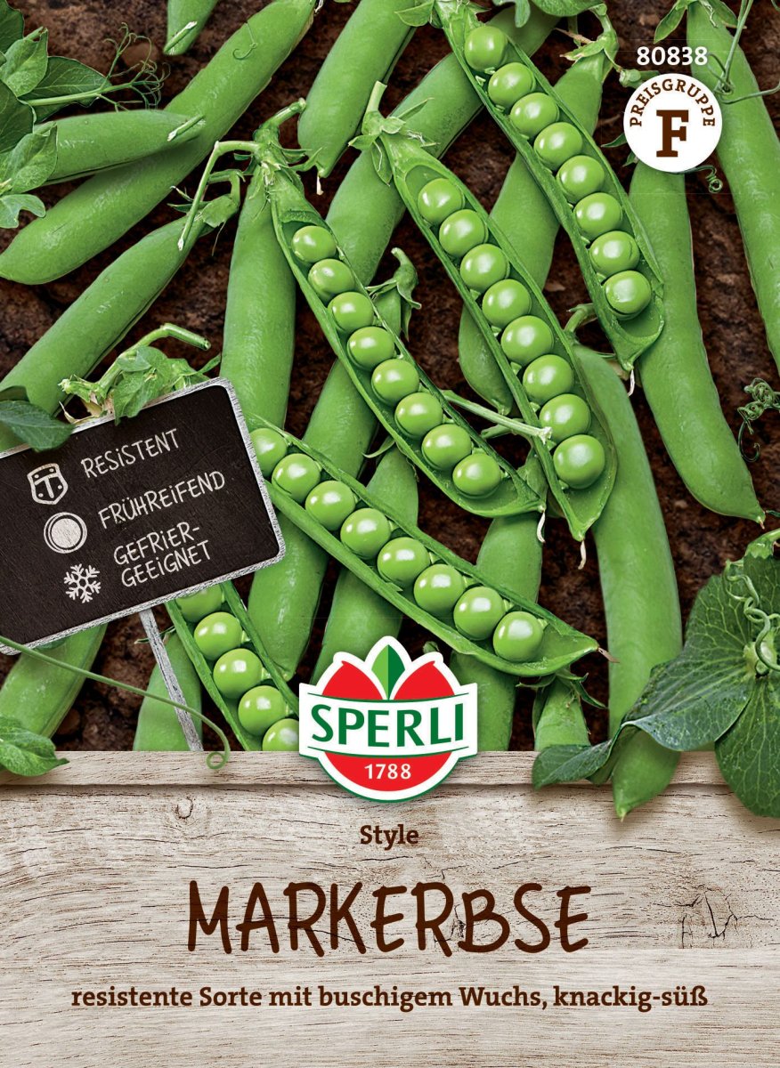 Die Sorte 'Style' ist wie ein echter Profi in Deinem Gemüsegarten! Schon früh im jahr begeistert sie mit ihren stumpfförmigen Hülsen, in denen sich 7-8 knackig-süße Körner verbergen. Die doppelthülsigen Markerbsen sind robust und trotzt den gängigen Welkekrankheiten. Mit ihrer standhaften Höhe von ca. 70 cm bleibt sie auch bei dichter Aussaat stabil, ganz ohne die Hilfe von Stützen. Wenn Du es leid bist, dich durch dichtes Laub zu kämpfen, wird Dir 'Style' gefallen. Sie hält sich nämlich zurück und produziert im Vergleich zu anderen Sorten nur verhältnismäßig wenig Grün. Um optimal zu gedeihen, braucht die Sorte durchlässige, feuchte und warme Böden. Ein kleiner Gärtnertrick: Häufle die Pflänzchen an, sobald sie die 20 cm Marke. erreichen. Das stärkt sie zusätzlich. Also, mach Die bereit für eine reiche Ernte in den Sommermonaten von Juni bis August.