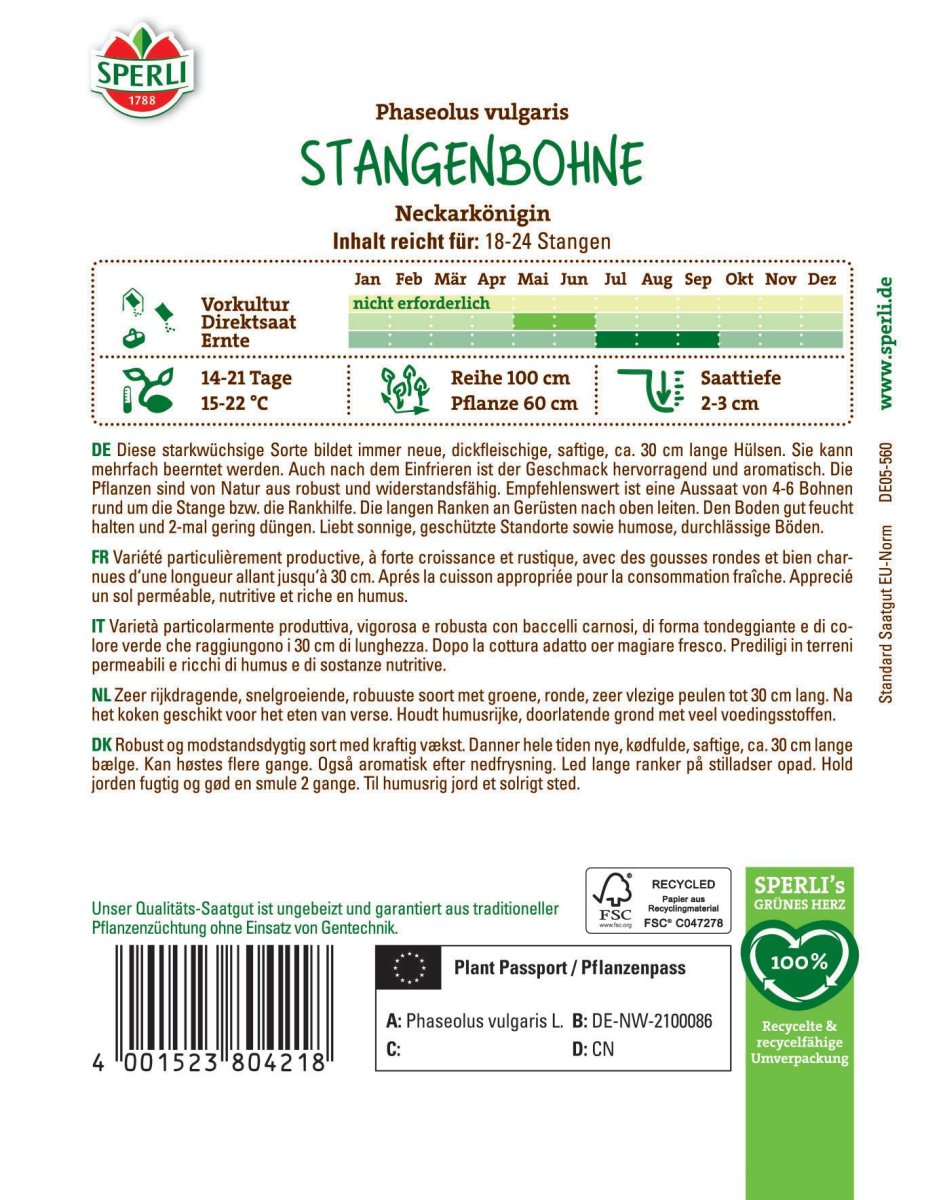 Gemüsesamen - Robuste, fadenlose und dickfleischige Sorte - Art.Nr.: 80421 Artikel-Nr.: 86000994 Hersteller: SPERLI GmbH