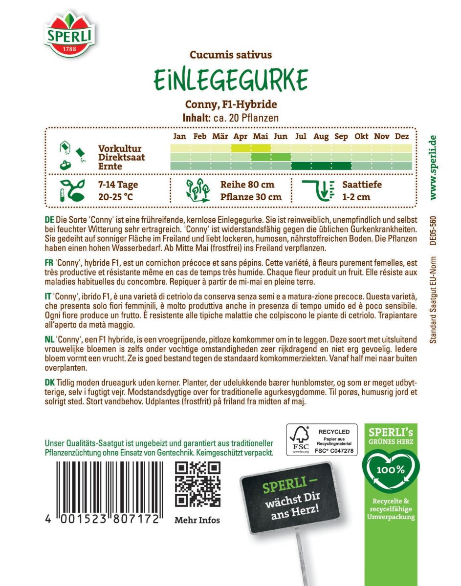 Die Einlegegurke 'Conny' ist eine F1-Hybride, die für den Anbau im Freiland wie geschaffen ist. Als Vorkultur können die Samen im April und Mai in einem schützenden Gewächshaus ausgebracht werden. Alternativ wartest Du bis Mai oder Juni und bringst die Gurkensamen an einem sonnigen bis halbschattigen Standort direkt aus. Da 'Conny' hinsichtlich Temperatur und Witterung sehr robust und zudem resistent gegen das Gurkenmosaikvirus, den Echten Mehltau und die Gurkenkrätze ist, kannst Du mit einer sicheren Ernte von Juli bis September rechnen.