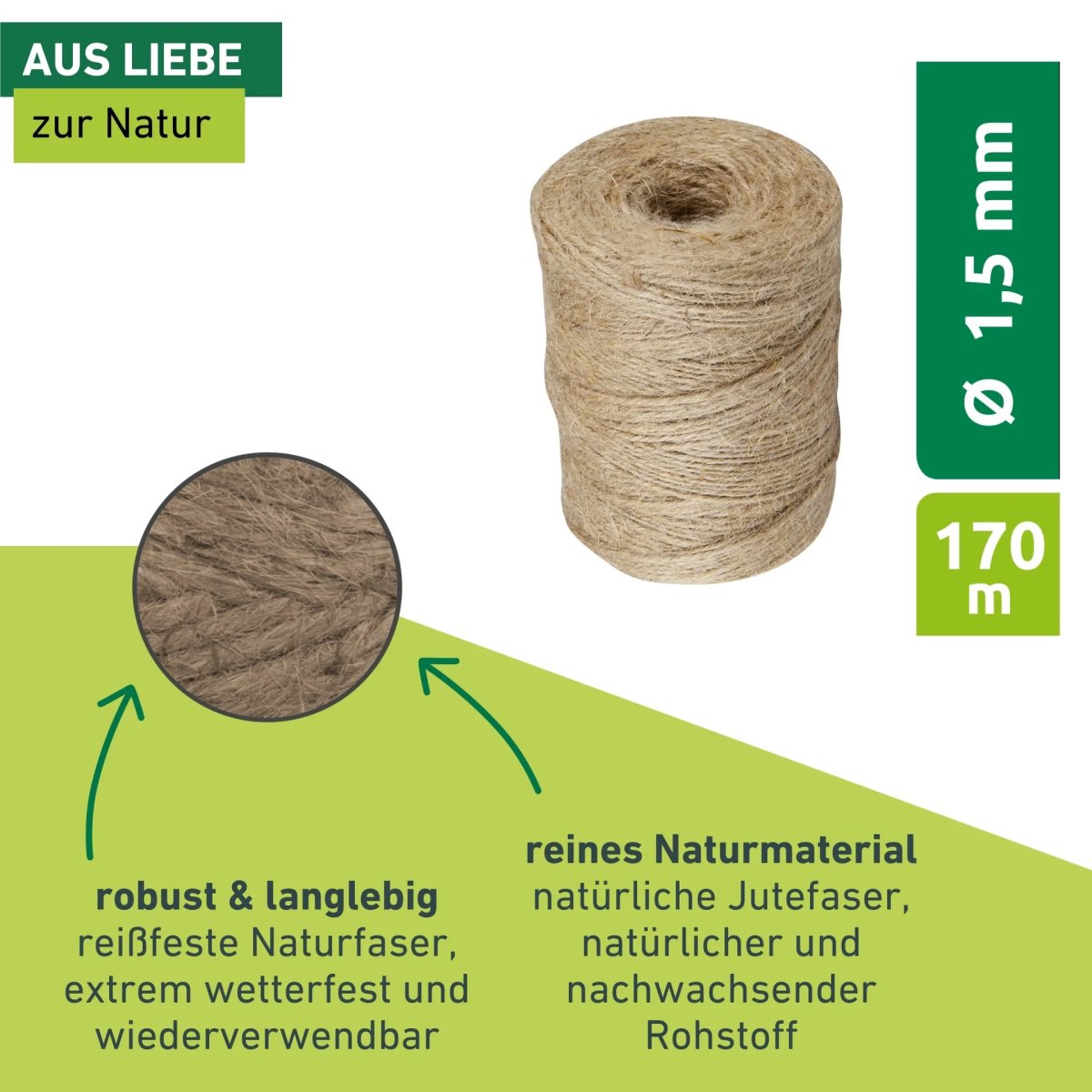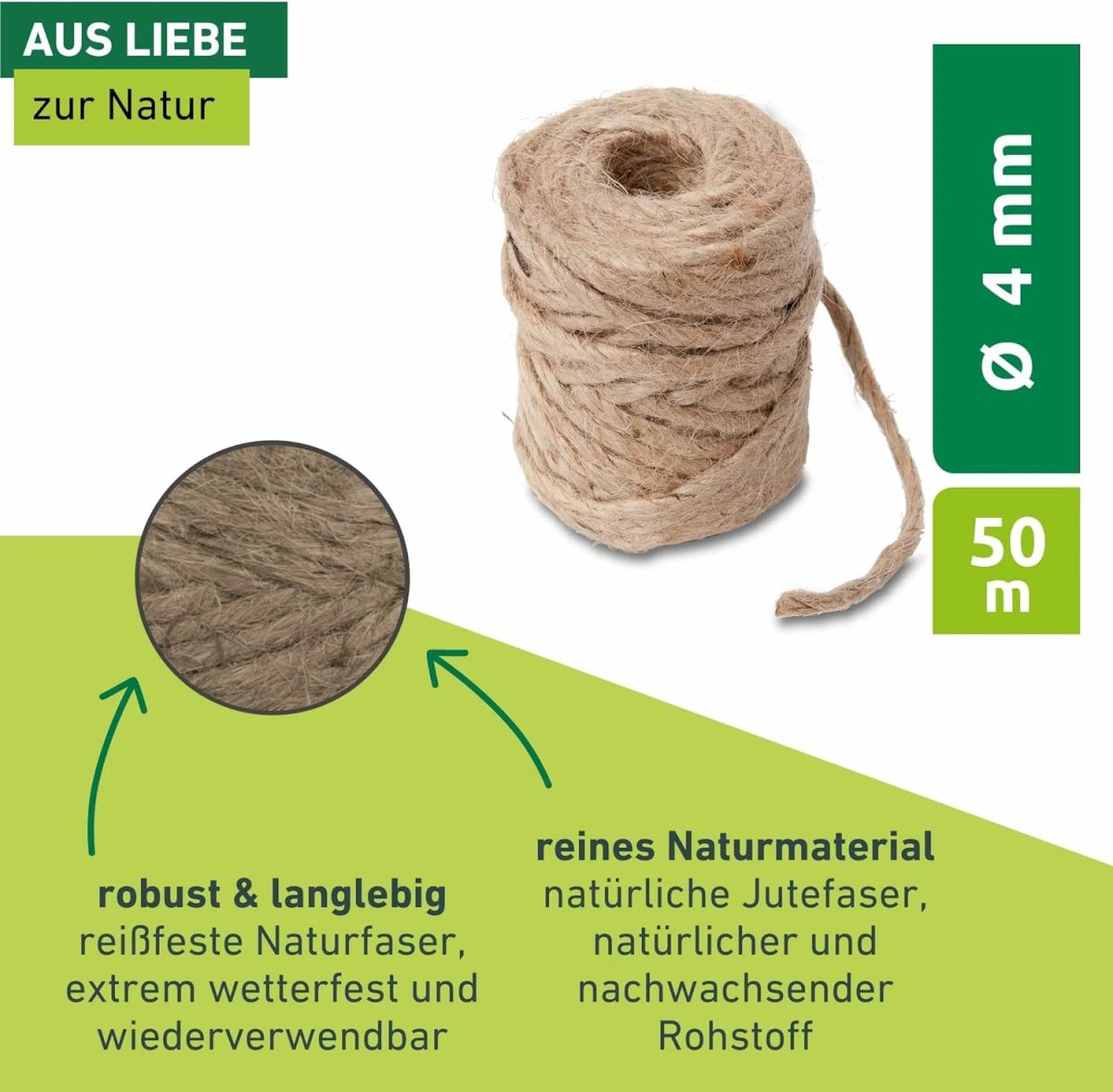 Die Schnur ist aus reißfester und witterungsbeständiger Jutefaser gefertigt.