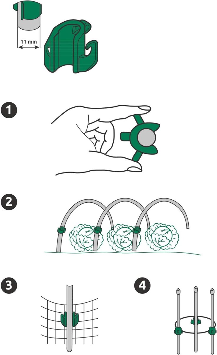 Diese Clips eignen sich für Rankhilfen mit 11 mm Durchmesser und sind flexibel einsetzbar, da sie Möglichkeiten zur Befestigung verschiedener Materialien, wie zum Beispiel Netzen und Drähten, bieten.