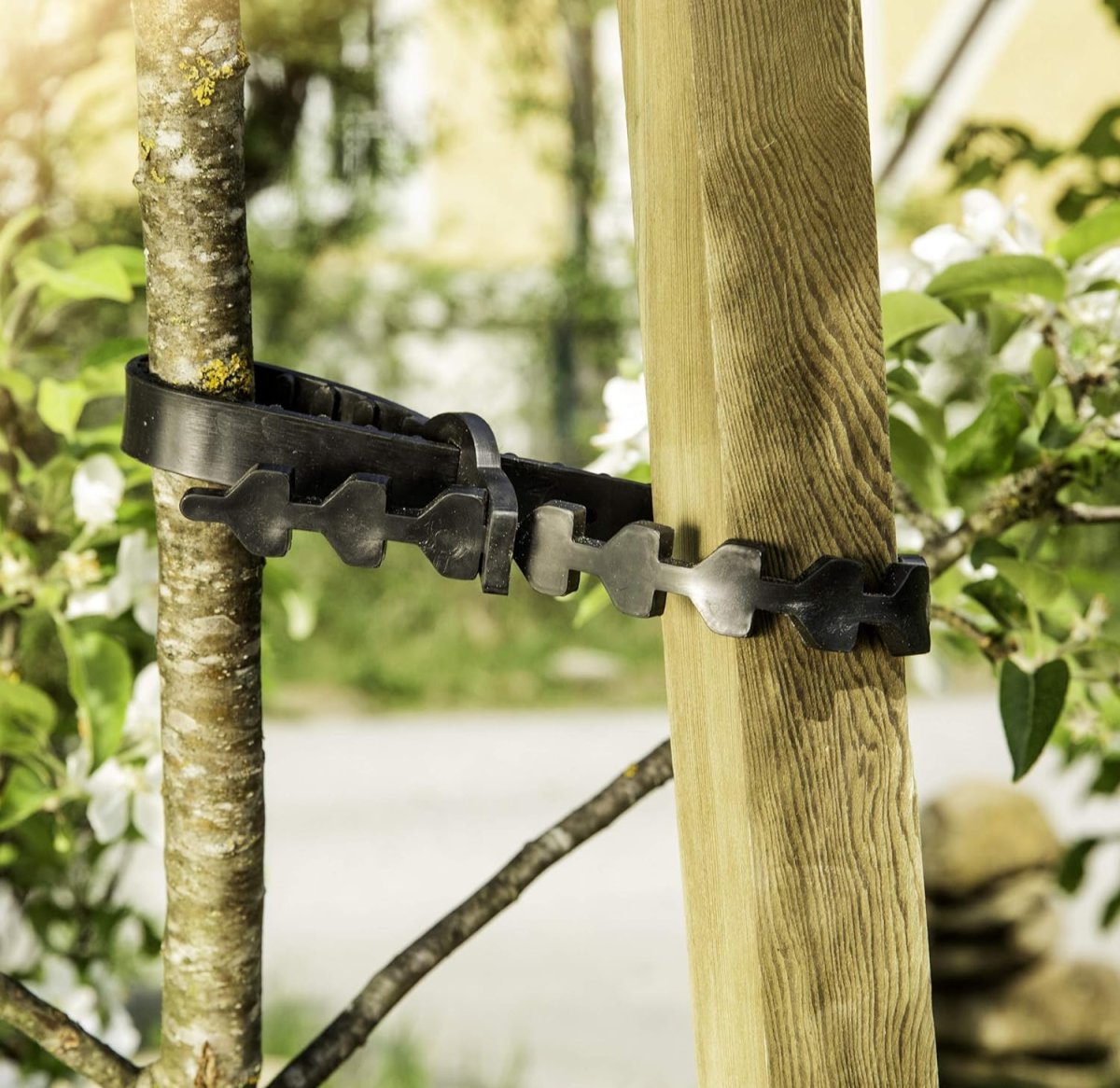 Mit dem passenden Holzpflock, ideal zum Festmachen von Bäumen gedacht. Durch die gezahnte Oberfläche sind keine Beschädigungen am Stamm zu erwarten. Das Material ist flexibel, elastisch und widerstandsfähig. Optimal also für einen dauerhaften Einsatz. Das individuell verstellbare Band kann je nach Bedarf enger oder lockerer gemacht werden. Eine robuste und sehr smarte Gartenhilfe, die einfach umkompliziert funktioniert!