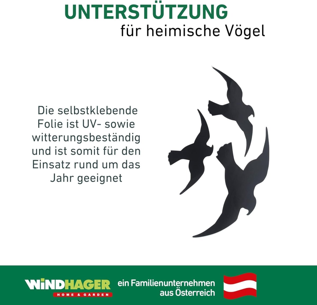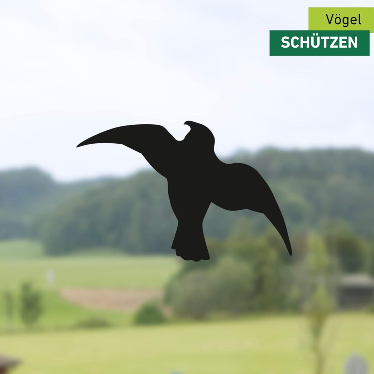 Vögel können große Glasflächen häufig nicht erkennen, vor allem wenn sie sich stark spiegeln. Der Flug gegen eine Scheibe kann schnell gefährlich für die Tiere werden. Häufig verletzen sie sich dabei, in manchen Fällen endet es auch tödlich. Um die Vögel zu schützen, sollten diese Vogel-Silhouetten auf großen und stark spiegelnden Glasflächen angebracht werden. So werden die Vögel gewarnt und die Verletzungsgefahr verringert sich. Die selbstklebende Folie ist UV- sowie witterungsbeständig und ist somit für den Einsatz rund um das Jahr geeignet.