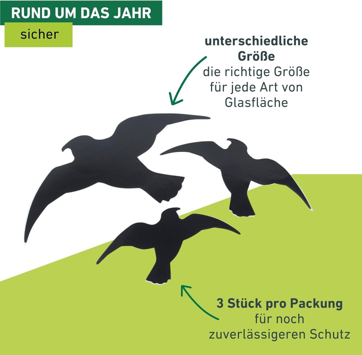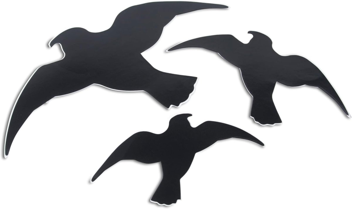 So funktioniert´s: In der Packung befinden sich drei Stück Vogel-Silhouetten in unterschiedlichen Größen. Die Sticker sind selbstklebend und sofort einsatzbereit. Sie können die Folie sowohl in Innen- als auch in Außenbereichen anbringen und nach Wunsch wieder ganz einfach entfernen. Die Vogelsticker sind zur Anwendung auf Fensterscheiben, Wintergärten, Lärmschutzwänden und anderen Glas- oder Spiegelflächen geeignet.