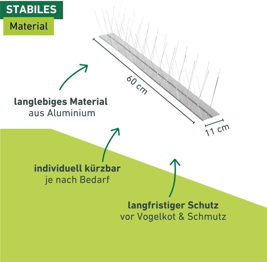- HOCHWERTIGE MATERIALIEN – Langlebiges Aluminium-Profil und Edelstahl-Spikes sorgen für langfristigen Schutz, rund um das Jahr