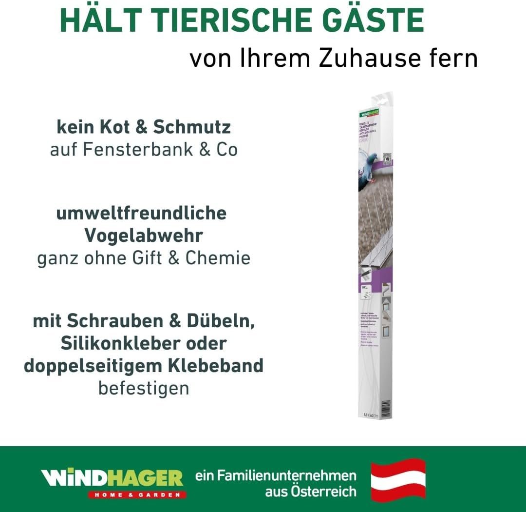 Haben Sie genug von Verschmutzungen durch Vögel auf Ihren Fensterbänken oder dem Balkongeländer? Wenn sich Tauben und Co rund um das Haus niederlassen, so bleiben häufig Kot und Schmutz zurück. Mit diesen Spikes lässt sich dieses Problem schnell und dauerhaft beheben. Die Vogelabwehr wird auf Fensterbänken, Balkongeländern oder Mauern angebracht und sorgt dafür, dass Vögeln keine Landefläche mehr zur Verfügung steht. Diese natürliche Art der Tierabwehr schadet der Umwelt nicht und stellt für die Tiere keine Verletzungsgefahr dar. Das hochwertige Profil aus Aluminium und Edelstahl-Spikes ergeben ein langlebiges Produkt, welches für den Dauereinsatz geeignet ist. Die Vogelabwehr schützt also rund um das Jahr, bei Wind und Wetter vor ungebetenen Gästen auf Fensterbank und Co. Das Aluminiumprofil lässt sich mit einer Säge kürzen und ist somit flexibel einsetzbar. Befestigen lässt sich die Vogelabwehr auf Untergründen wie zum Beispiel Beton, Marmor, Holz, etc.