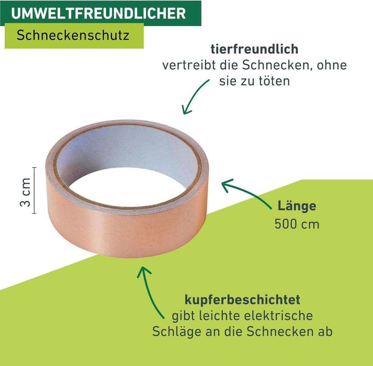Durchlöcherter Salat und angeknabberte Erdbeeren können einem schnell die Freude am eigenen Garten verderben. Mit einem Kupferband treten Sie der Schneckenplage endlich entgegen - und das ganz tierfreundlich. Das Abwehrband wird rund um Pflanztöpfe, Frühbeete und Hochbeete geklebt. Gut befeuchtet bildet sich eine Oxidationsschicht, welche für Schnecken eine unüberwindbare Barriere darstellt. Kommen sie nämlich mit dem Kupfer in Kontakt, gibt das Kupfer kleine elektrische Schläge ab. Diese sind für die Schnecken so unangenehm, dass sie die Flucht ergreifen und umkehren. Die natürliche Schneckenbekämpfung mit einem Kupferband funktioniert ganz ohne Einsatz von Gift und Chemie.