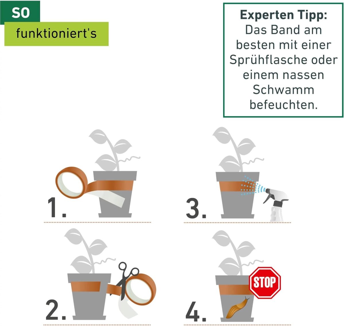 So funktioniert´s: Das praktische Kupferband ist bereits mit einer selbstklebenden Oberfläche ausgestattet und kann direkt am Topf, Früh- oder Hochbeet befestigt werden. Das Schnecken Abwehrband kann ganz leicht mit der Schere auf das gewünschte Maß gekürzt werden. Die Klebeoberfläche haftet sowohl auf glatten als auch auf rauen Oberflächen. Wichtig ist, dass Sie das Kupferband lückenlos rund um Hochbeet oder Pflanztopf kleben. Danach muss das Band nur noch gut befeuchtet werden. Das funktioniert am besten mit einer Sprühflasche oder einem nassen Schwamm. Auf diese Weise bildet sich die Oxidationsschicht, die die Schnecken von Ihren Pflanzen fernhält. Befeuchten Sie das Kupferband regelmäßig.