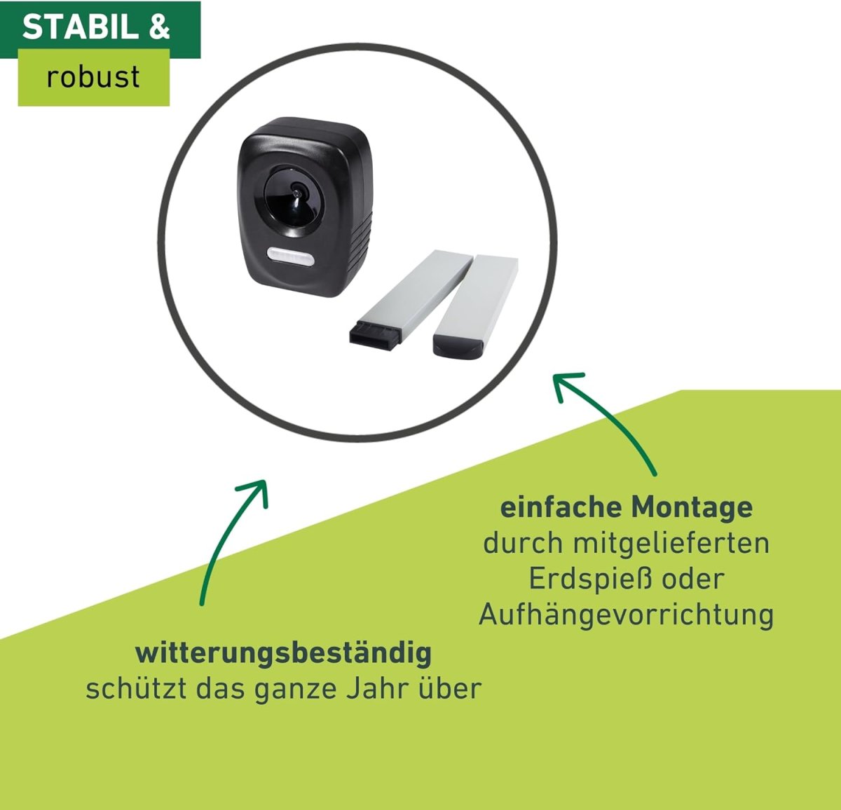 So geht´s: Als ersten Schritt müssen 3x AA-Batterien eingesetzt werden, diese sind nicht im Lieferumfang enthalten. Um den Tiervertreiber anschließend aufzustellen, haben Sie zwei Möglichkeiten. Sie können das Gerät entweder mit dem enthaltenen Erdspieß in den Rasen stecken oder an der Aufhängevorrichtung anbringen. Das Gerät sollte nicht verdeckt sein, denn so wird die Wirkung eingeschränkt. An der Unterseite können Sie das Gerät einschalten und einen der drei Betriebsmodi wählen. Schon macht sich der GUARD an die Arbeit und Ihr Garten ist geschützt.
