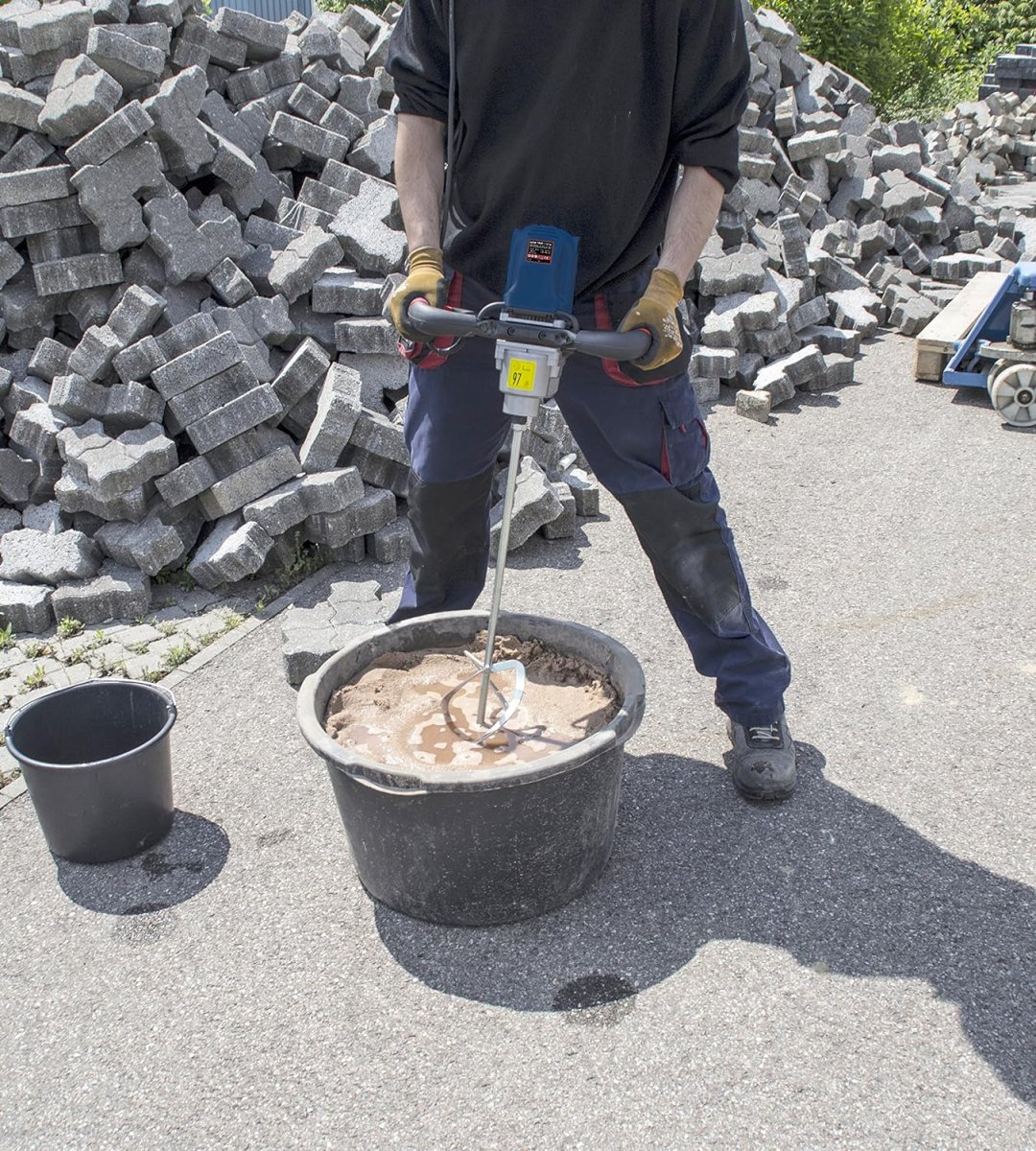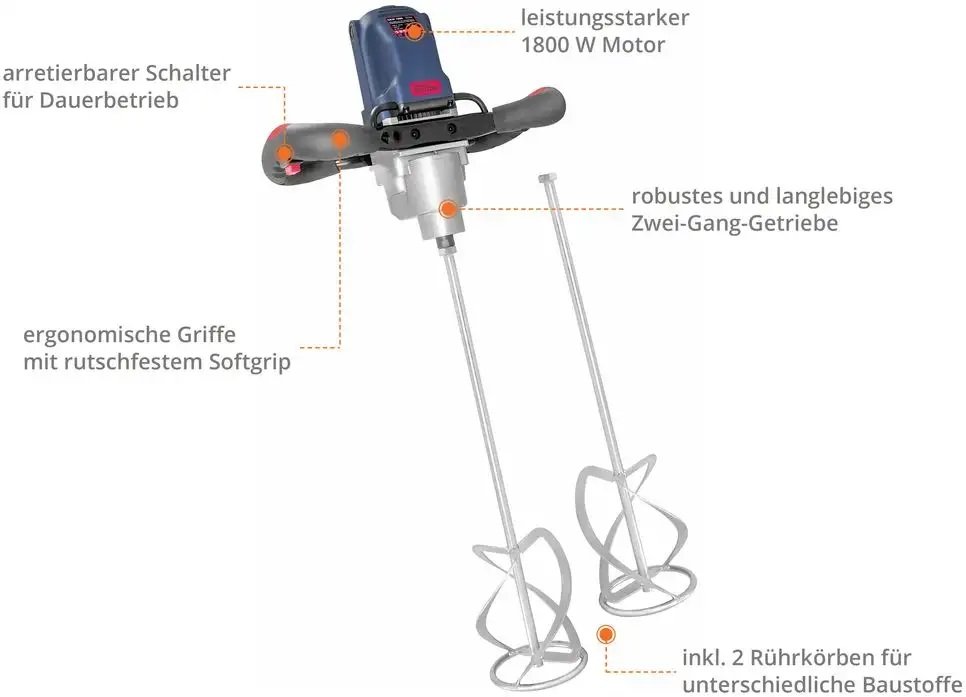 - Lieferumfang: Motoreinheit, Rührkorb für grobe Baustoffe wie Mörtel, Putz oder Kleber, Rührkorb für feine Baustoffe wie Farben und Dispersionen