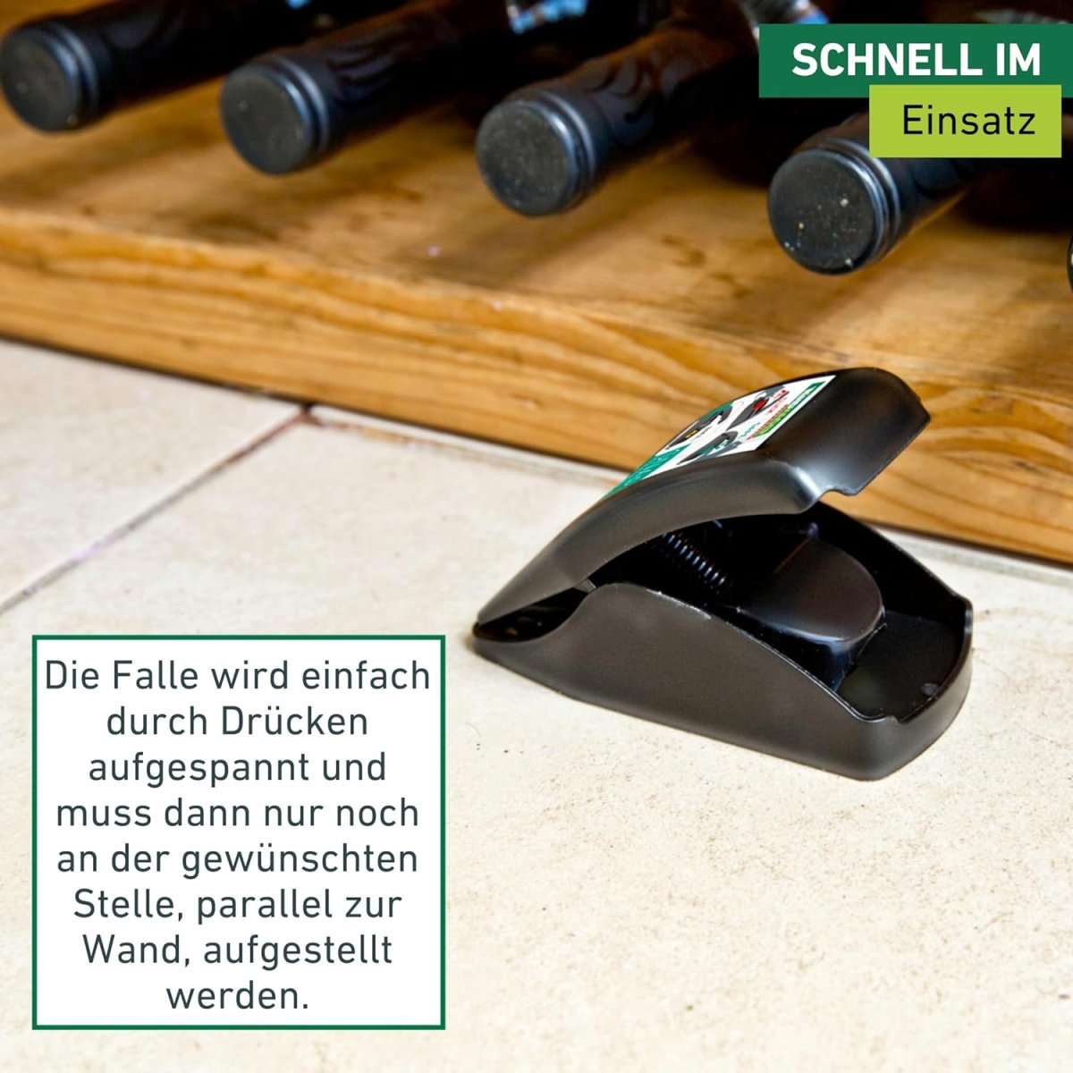 So funktioniert´s: Die Falle wird einfach durch Drücken aufgespannt und muss dann nur noch an der gewünschten Stelle, parallel zur Wand, aufgestellt werden. Tappt eine Maus oder Ratte in die Falle, kann diese ganz unkompliziert entfernt werden, ohne dass das Tier direkt berührt werden muss. Den Kunststoff danach einfach reinigen - schon ist die Falle wieder einsatzbereit.