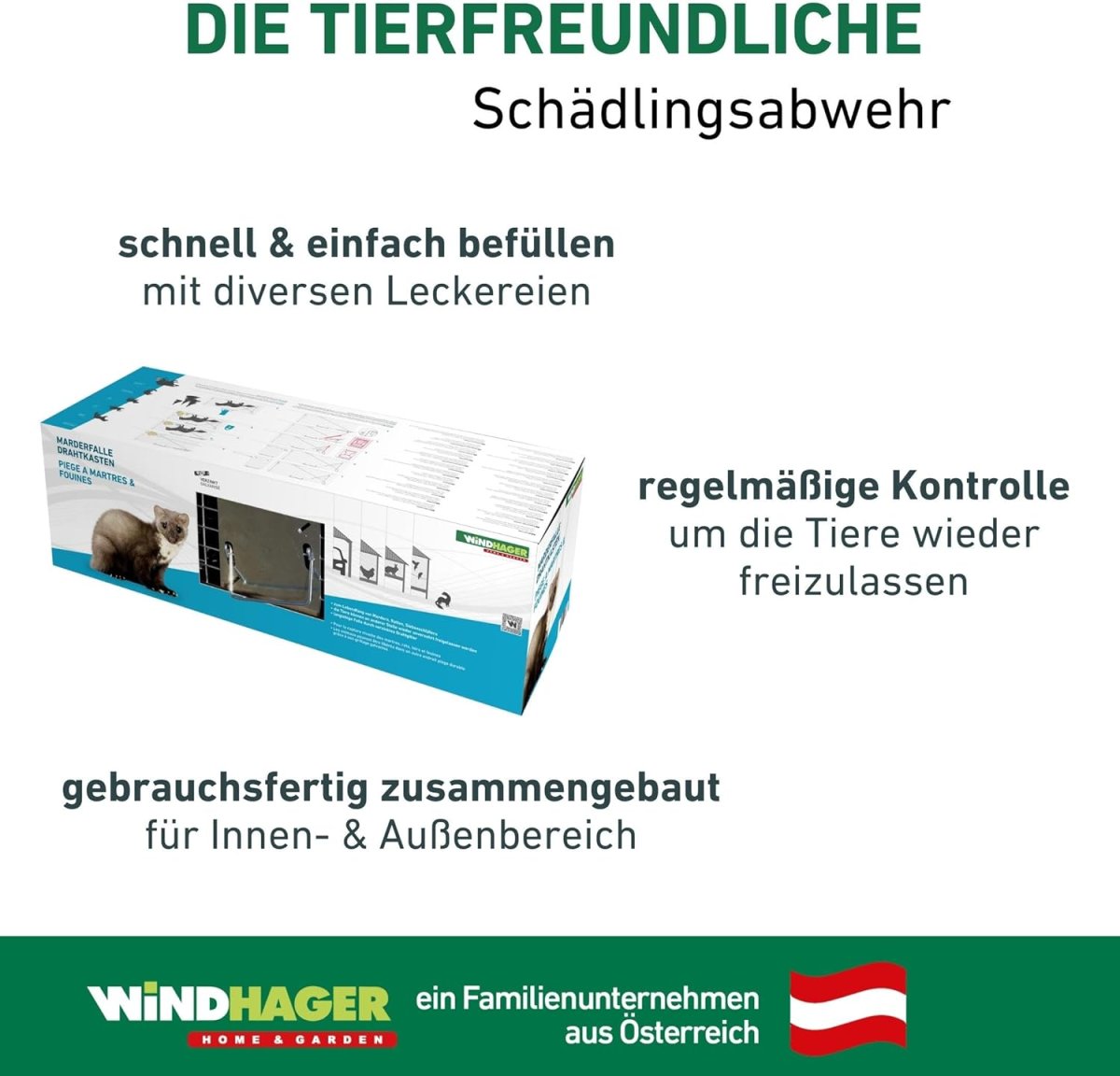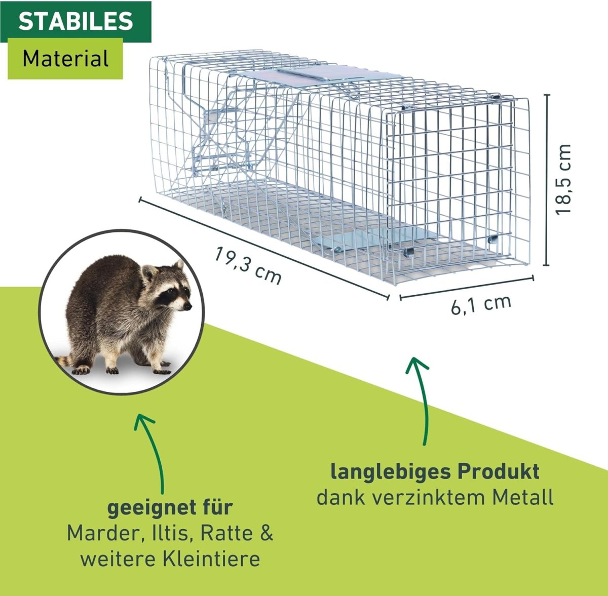 Wenn Marder und andere kleine Nagetiere sich an Ihrem Eigentum zu schaffen machen, ist das ärgerlich. Zerbissene Autokabel, geplünderte Vorratskammer und Verschmutzungen sind dann oft die Folge. Mit einer Lebendfalle lassen sich die ungebetenen Gäste einfangen und an einer geeigneten Stelle unbeschadet wieder freisetzen. Mit dieser Art der Schädlingsbekämpfung sorgen Sie tier- und umweltfreundlich für ein schädlingsfreies Zuhause – ganz im Einklang mit der Natur. Die Falle ist mit einer Größe von 19,3x6,1x18,5 cm für den Lebendfang von Mardern, Ratten, Siebenschläfern und Waschbären geeignet. Sie kann sowohl in Außen- als auch in Innenbereichen angewendet werden.