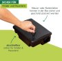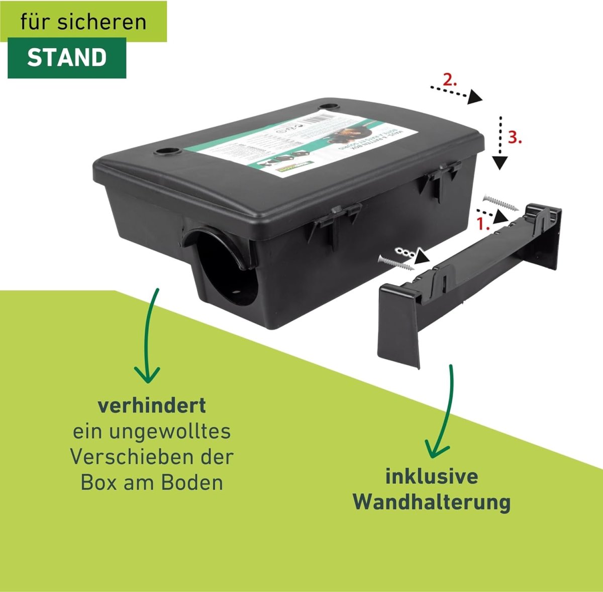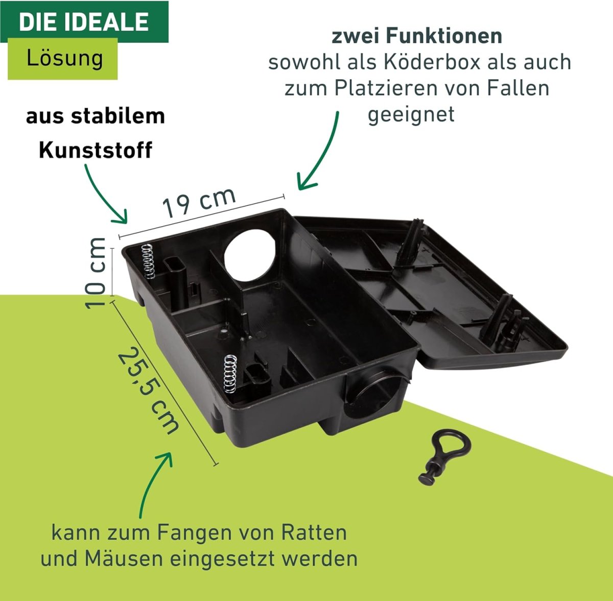 Es kann entweder ein Giftköder oder eine Mausefalle im Inneren platziert werden. Die Box aus stabilem Kunststoff kann sowohl im Innen- als auch im Außenbereich aufgestellt werden und verhindert, dass Haustiere und Kinder an den Inhalt kommen. Mit dem mitgelieferten Schlüssel kann die Box verschlossen werden, was für zusätzliche Sicherheit sorgt. Die 2in1 Mäuse- und Rattenbox kann zudem dank der beigefügten Halterung an der Wand fixiert werden, um ein ungewolltes Verschieben am Boden zu verhindern.