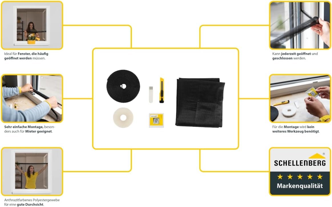 Für die Montage ganz ohne Bohren und Schrauben liegt dem Komplett-Set bereits alles bei, was du benötigst: vom Befestigungsband bis hin zum Cutter-Messer, Reinigungstuch und der Andrückhilfe für das Gewebe. Du kannst das EASY OPEN Fliegengitter 130 x 150 cm individuell kürzen, genauso, wie du es brauchst. Das Insektenschutz-Gewebe in Anthrazit ist UV-stabilisiert und waschbar bis 30°C. Einfach praktisch und zuverlässig.