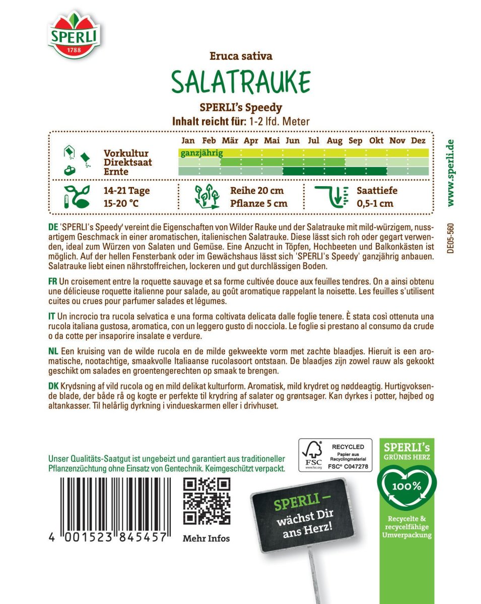 Bei 'SPERLI's Speedy' handelt es sich um eine besondere Salatrauke, die aus der Kreuzung von Wilder Rauke und Salatrauke hervorgegangen ist. Ihr Geschmack ist mild-würzig und nussig. Ob Du die Blätter garst oder roh zum Würzen, Verfeinern oder Garnieren verwendest, bleibt ganz Dir überlassen. Lecker sind sie allemal!
