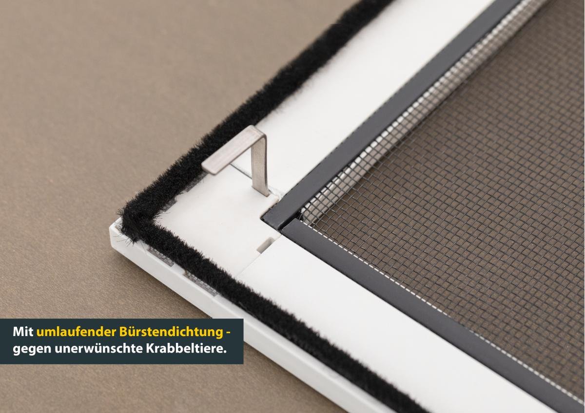 Die PREMIUM Insektenschutz-Lösungen mit langlebigem Klarsicht-Fiberglas-Gewebe im stabilen Aluminium-Rahmen, halten Wohnräume zuverlässig frei von Insekten wie Fliegen, Mücken, Wespen und Kriechtieren. Neben der hervorragenden Durchsicht ermöglicht das Premium Gewebe eine bis zu 30% bessere Luftzirkulation sowie eine bis zu 40% bessere Durchsicht im Vergleich zu herkömmlichem Fiberglas-Gewebe. Zudem ist das Gewebe UV-stabil, reißfest und abwaschbar. Eine umlaufende Bürstendichtung sorgt für zusätzlichen Schutz gegen Kriechtiere.