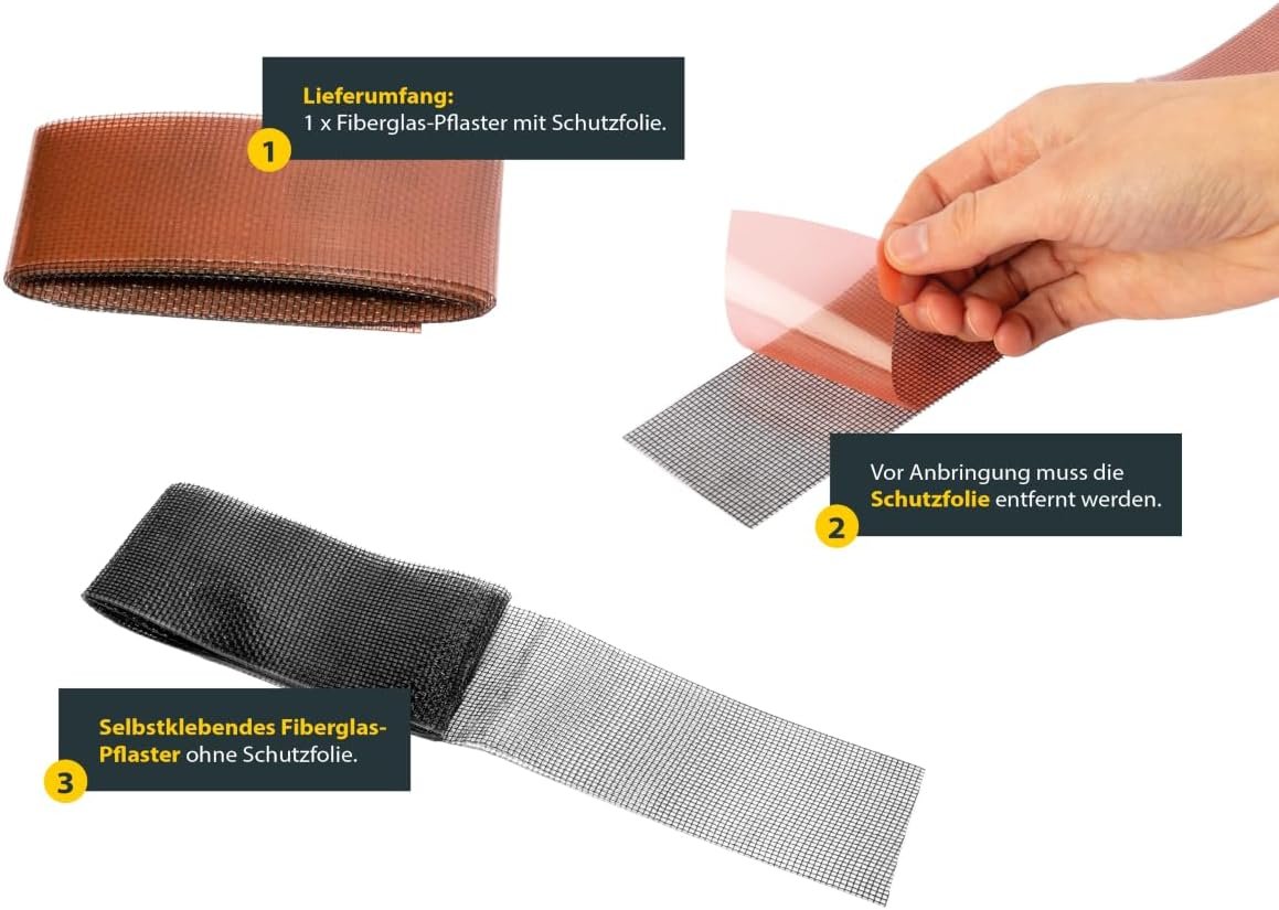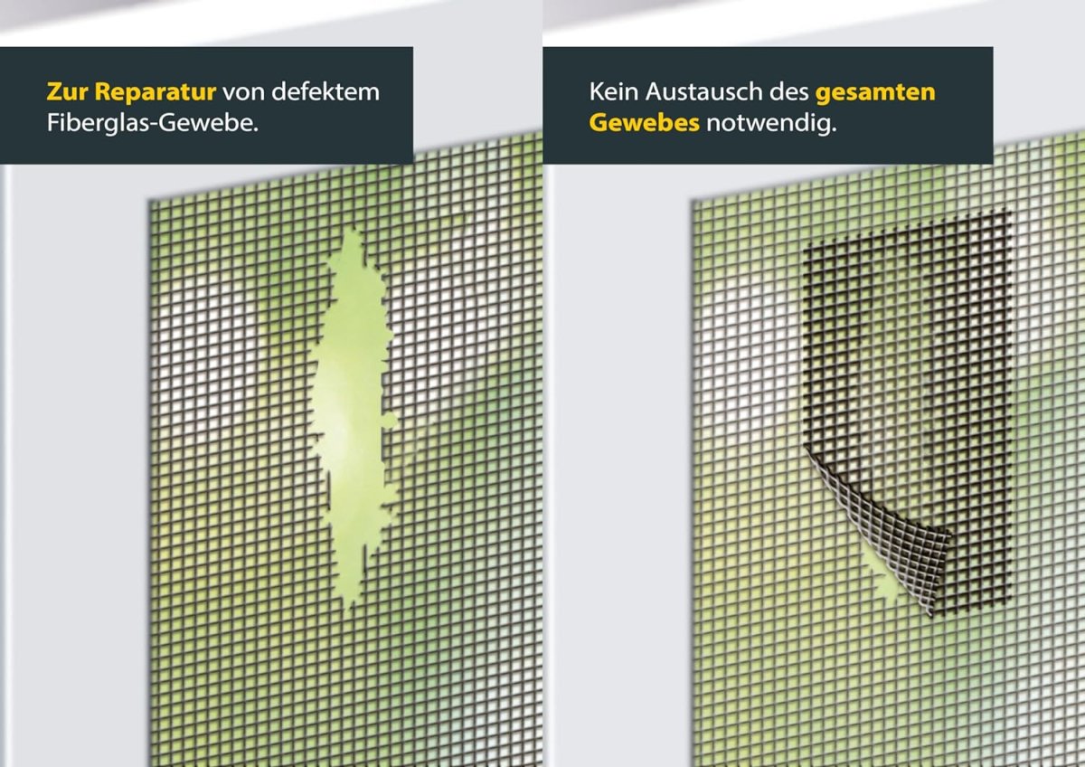 Das Fiberglas-Pflaster in Anthrazit mit den Maßen 5 x 100 cm ermöglicht eine unkomplizierte Reparatur von defekten Fliegengittern in Insektenschutz-Türen und Insektenschutz-Fenstern. Löcher und Risse im Fliegengitter lassen sich so im Handumdrehen und unauffällig ausbessern.