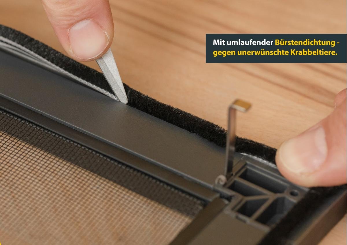 Dank des praktischen Komplett-Sets sind Anwendung und Anbringung des Fensters ganz einfach und bequem. Nachdem die Aluminium-Profile auf das benötigte Maß gekürzt wurden, werden die Rahmenelemente mit den beiliegenden Eckverbindern verbunden. Das KLARSICHT-Fiberglas-Gewebe wird anschließend mit dem Schlagkeder auf dem Rahmen fixiert und überstehendes Gewebe mit dem beigefügten Cuttermesser entfernt. Ganz ohne Bohren oder Schrauben kann der Rahmen mittels der Edelstahl-Einhängefedern ein- und wieder ausgehängt werden. Für eine nahezu lückenlose Abdichtung des Fensters verfügt der PREMIUM-Alurahmen zudem über eine optimierte Profilgeometrie, die einer ungewollten Profilbiegung entgegengewirkt.
