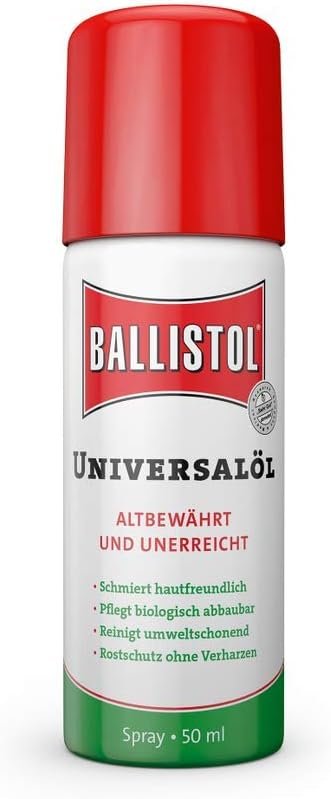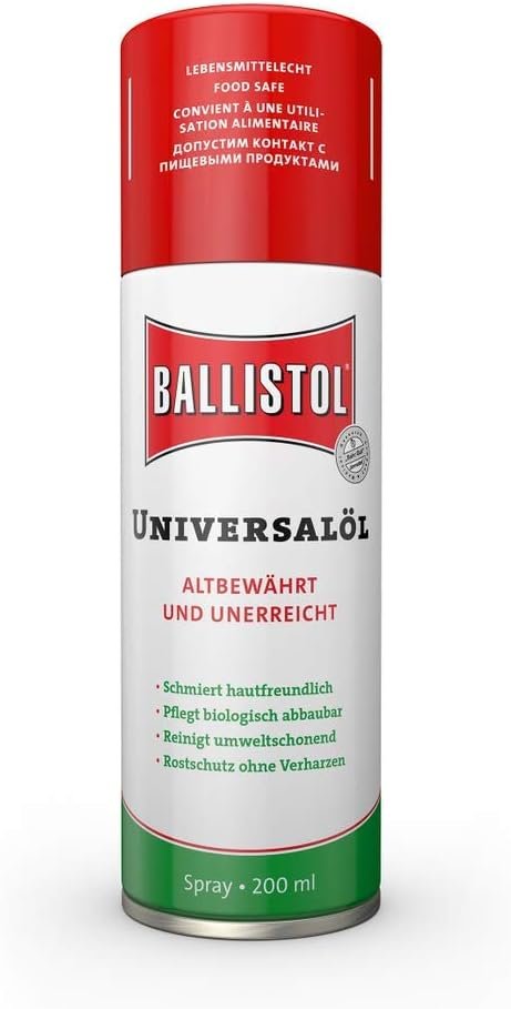 Ballistol Universalöl wurde bereits 1904 entwickelt und wird seither nach unveränderter Rezeptur in Deutschland hergestellt. Alle in Ballistol Universalöl enthaltenen Wirkstoffe sind besonders rein, biologischer Herkunft und vollständig abbaubar. Das Basisöl für Ballistol Universalöl ist von medizinischer Reinheit, frei von chlorierten Kohlenwasserstoffen und enthält keinerlei Stoffe tierischer Herkunft.