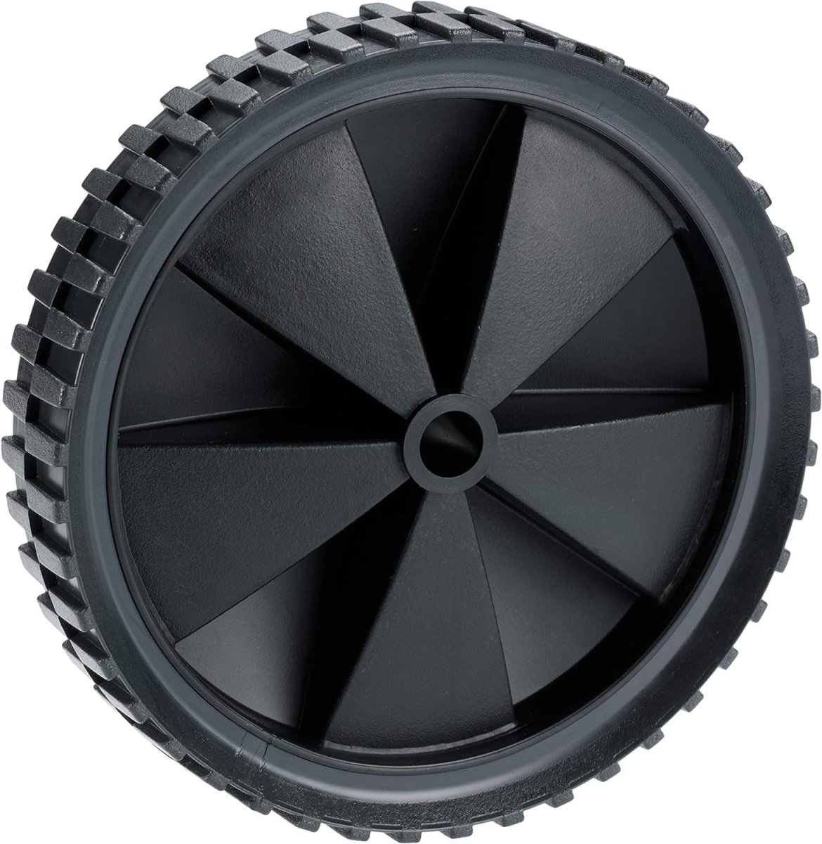 Leichtes Rad mit schwarzer Kunststofffelge, Gleitlager und Stollenprofil.