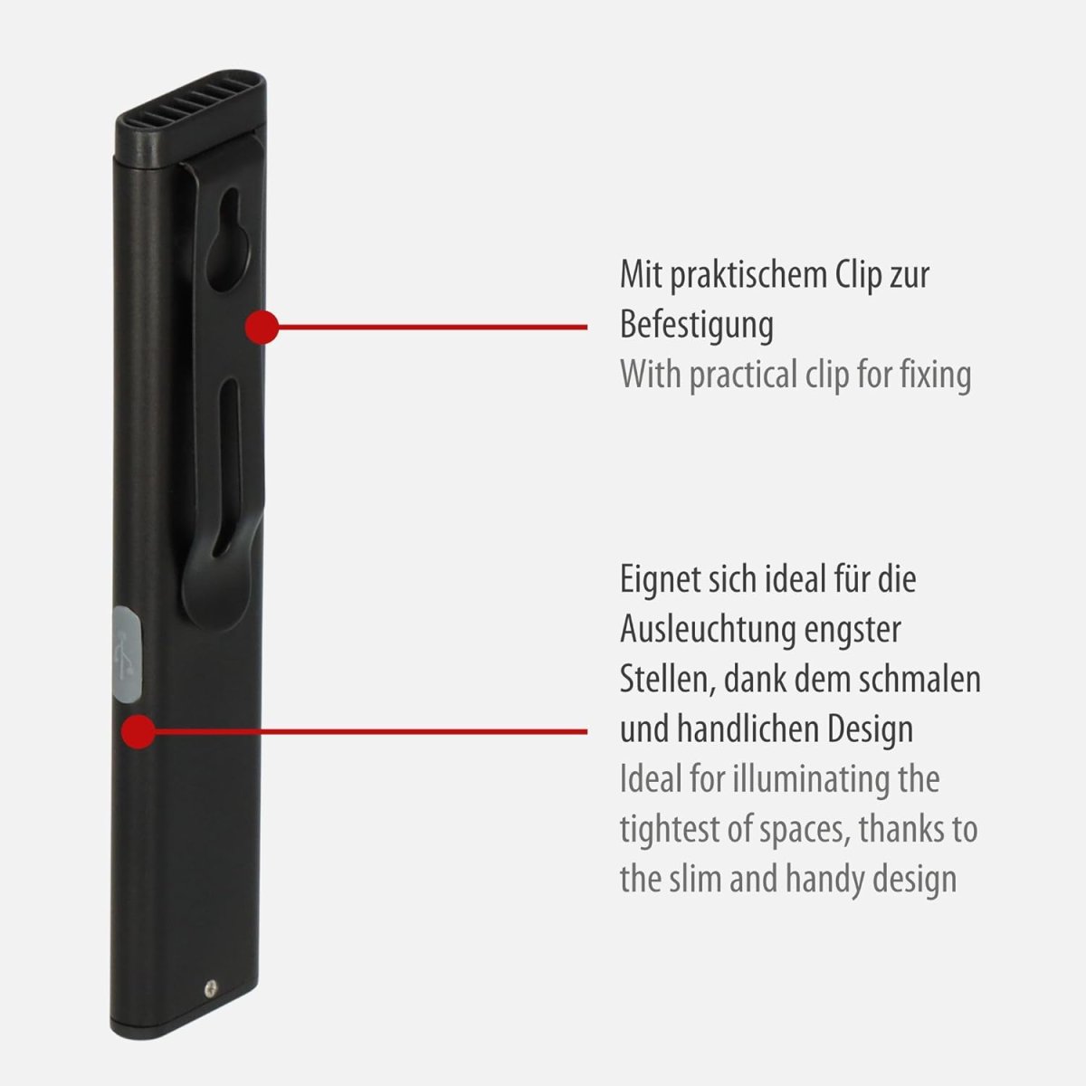 Die Akku LED Handleuchte leuchtet dank leistungsstarker COB LED dunkle Orte perfekt aus bei einer Leuchtdauer von maximal 12 Stunden. Die akkubetriebene Arbeitsleuchte verfügt über einen praktischen Clip an der Rückseite und einen Magnet im Haltefuß und lässt sich daher flexibel anbringen. Die Inspektionsleuchte mit einem integrierten Li-Pol-Akku (3,7V / 450mAh) mit Ladeanzeige verfügt über insgesamt fünf verschiedene Leuchtmodi und eignet sich daher für den universellen Einsatz, z. B. im Haushalt, in Werkstätten oder bei Kfz Reparaturarbeiten. Die handliche Taschenlampe überzeugt außerdem durch folgende Eigenschaften: