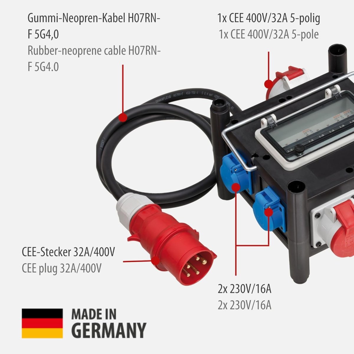 - Stecker: CEE 400 V/32 A 5-polig/-pin