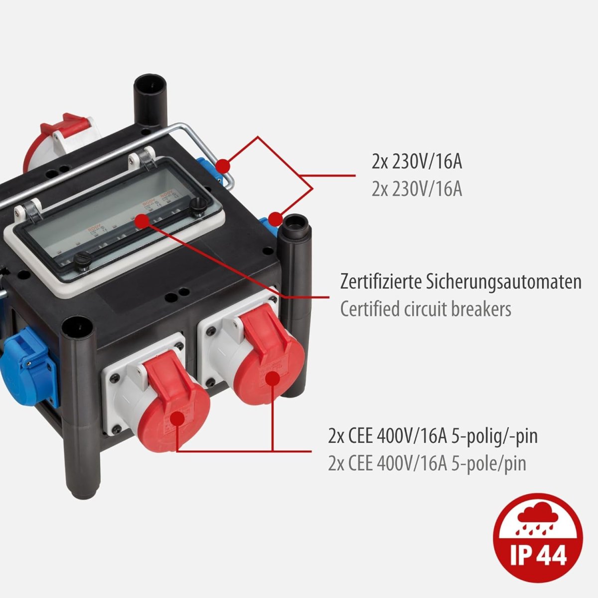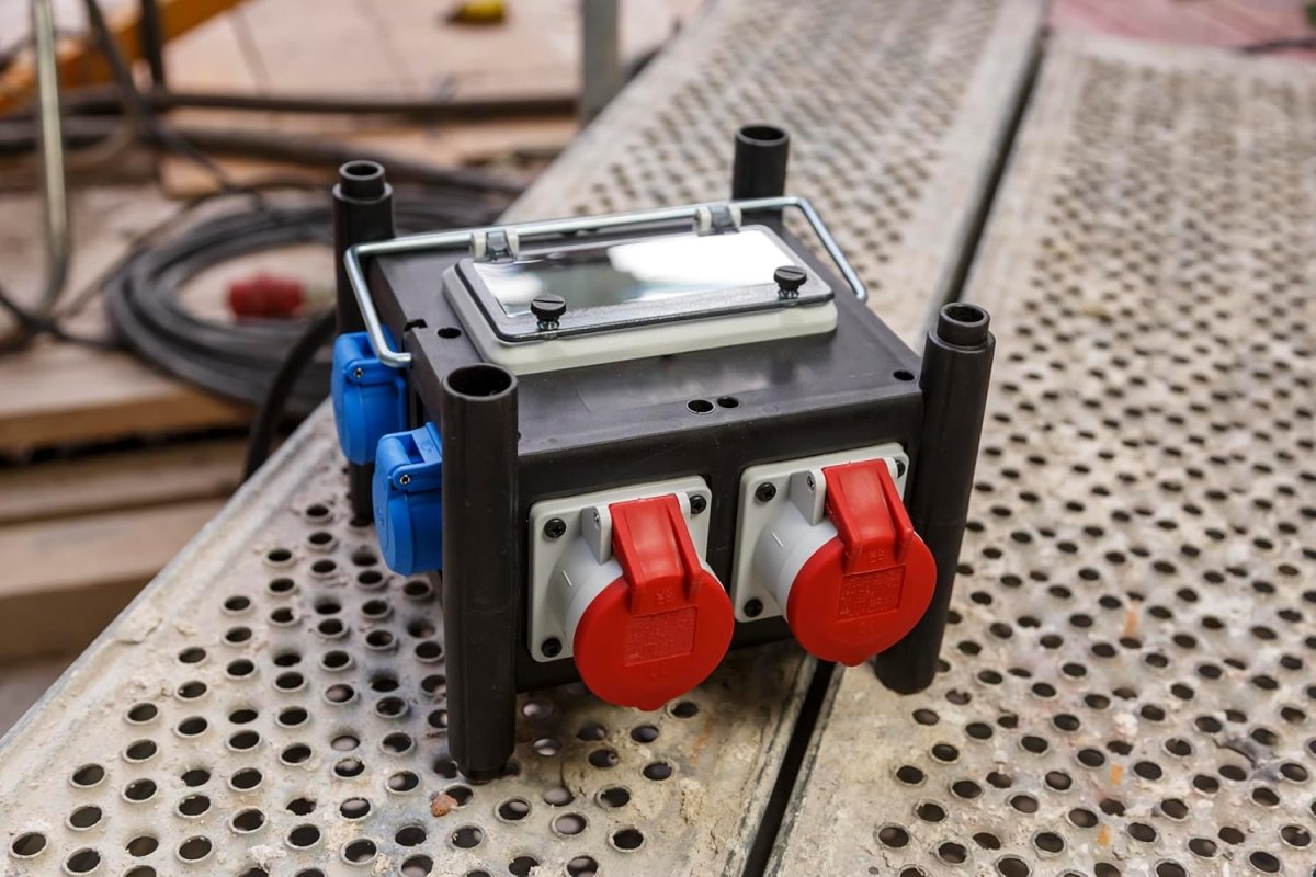 - Gummi-Bauverteiler mit Qualitätssteckdosen nach VDE 0620-1 ist beständig gegen diverse Öle, Fette, Benzin und Säuren, UV- und Ozonstrahlung - mit zertifizierten Sicherungsautomaten für Ihre Sicherheit