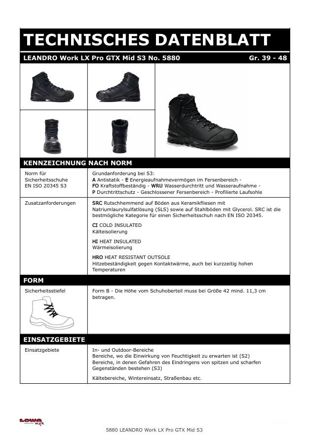 - Nach EN ISO 20345 S3 CI/HI/HRO/SRC, Form B
